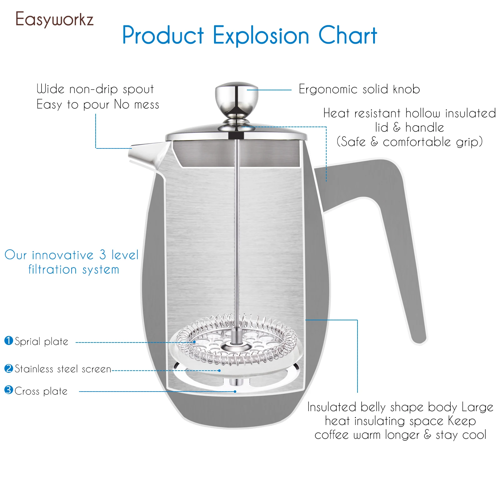 Easyworkz Nando French Press Cafetière thermique isolée à double paroi Cafetiere en acier inoxydable 304