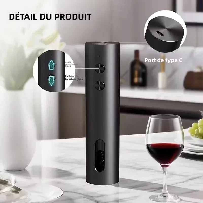 Ouvre-bouteille électrique Rechargeable avec coupe-feuille, verseur de vin et bouchon sous vide, chargement USB-C, conception compacte pour la cuisine domestique
