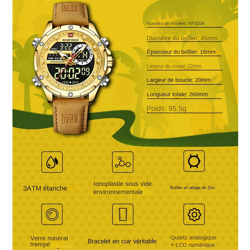 NAVIFORCE luxe montres originales pour hommes Sport décontracté chronographe alarme Quartz montre-bracelet en cuir étanche horloge numérique 9163