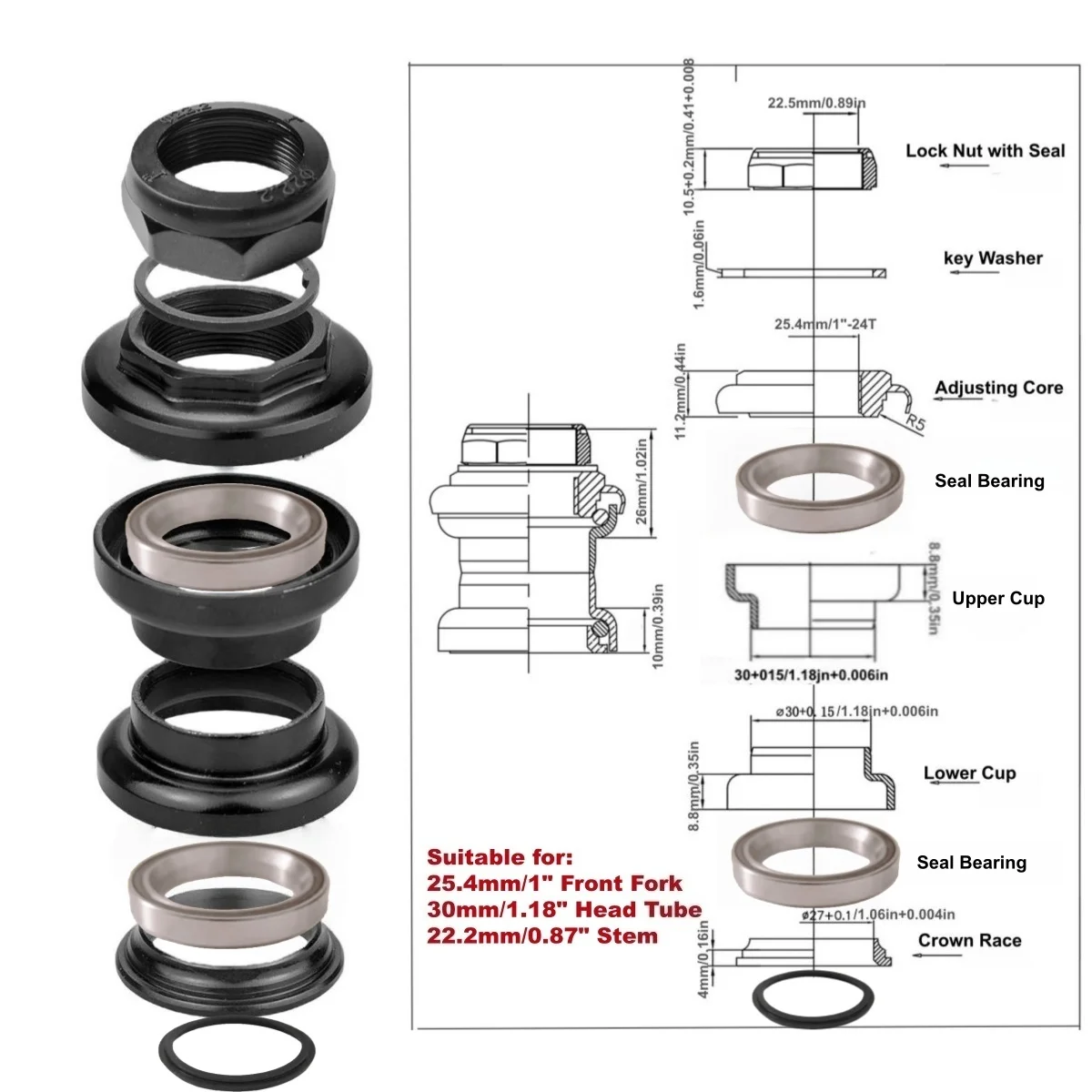 Boîtier de direction de vélo 25,4 mm/1 pouce avec roulement étanche pour tube de direction de 30 mm, boîtier de direction de vélo léger