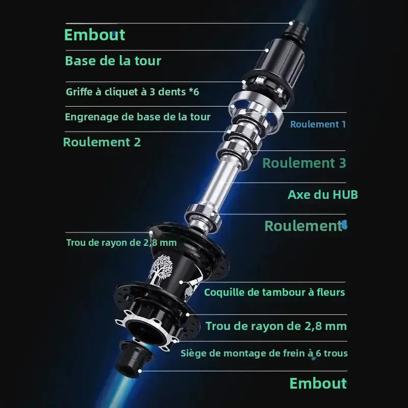 Frein à disque QR, roue libre GH, 6 roulements étanches.