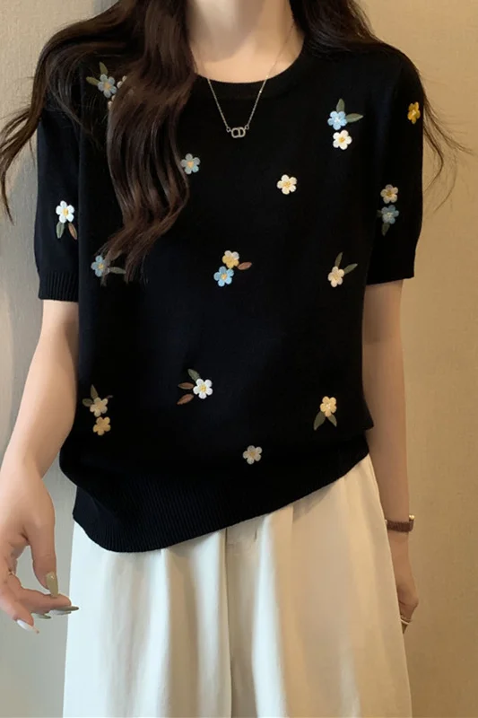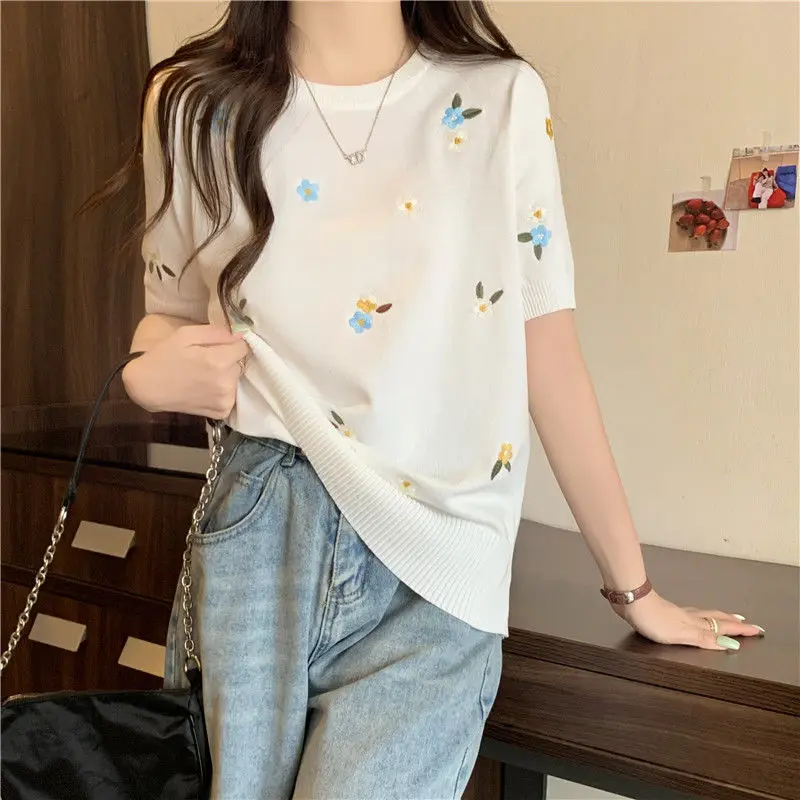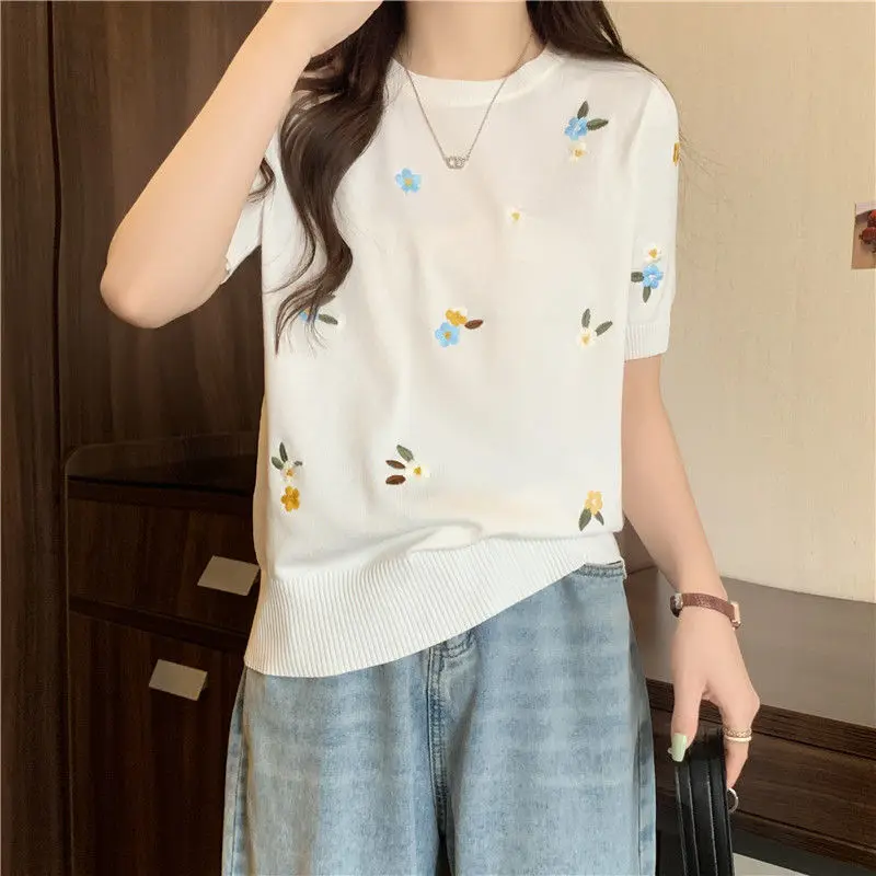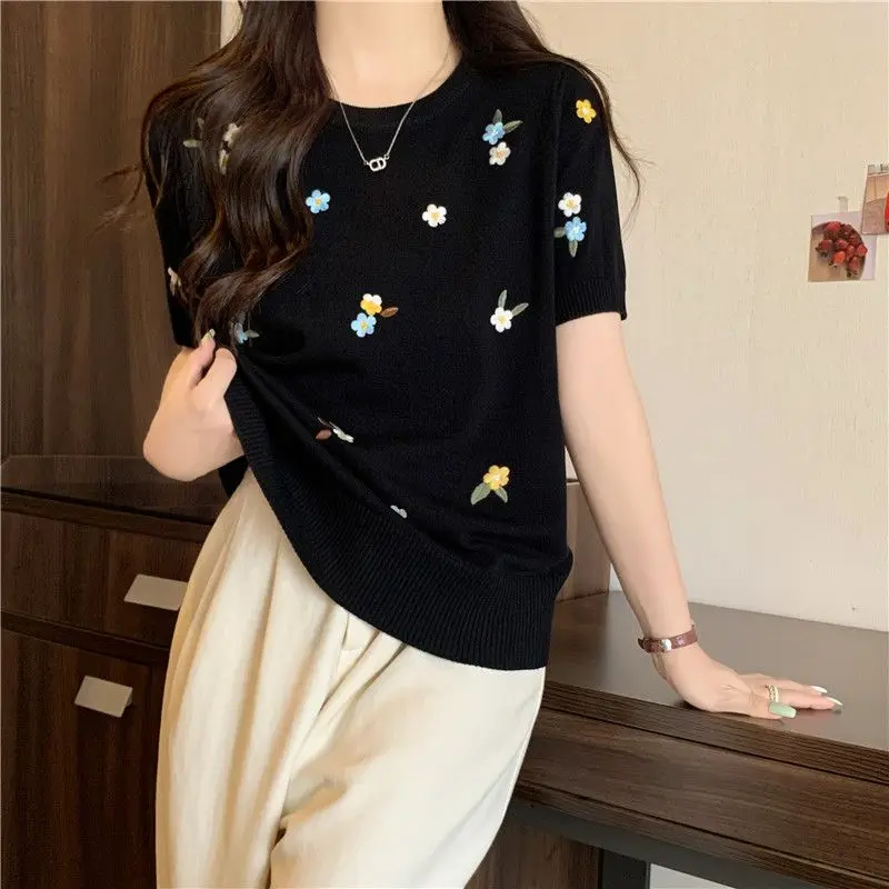 Haut de tempérament en soie glacée pour femmes, pull d'été, T-shirt à manches courtes