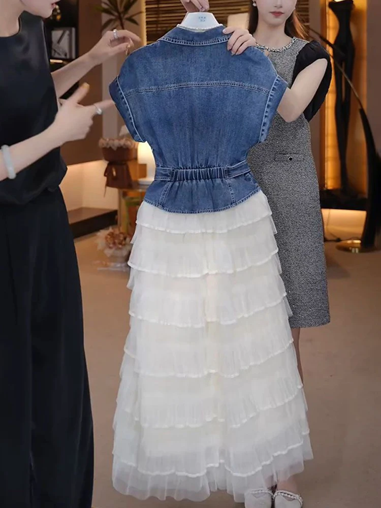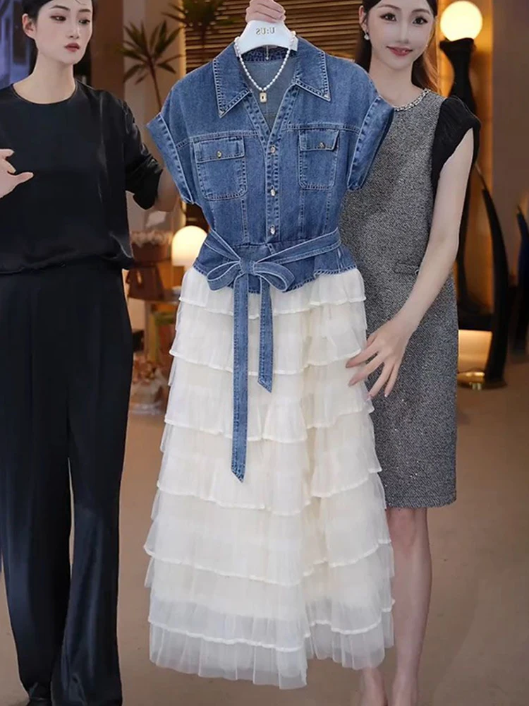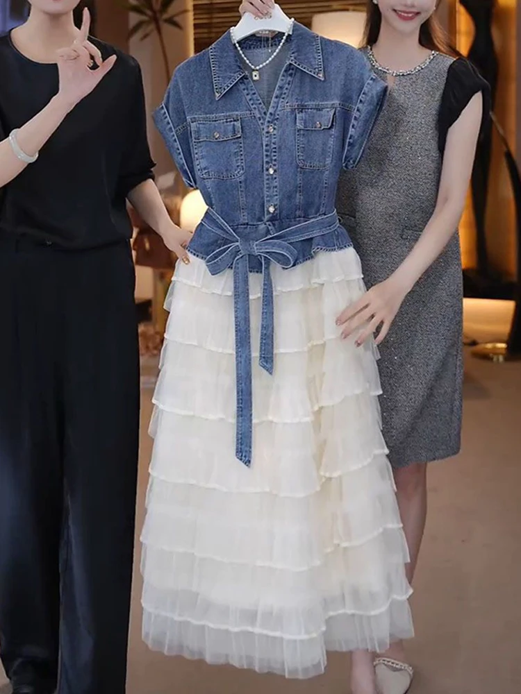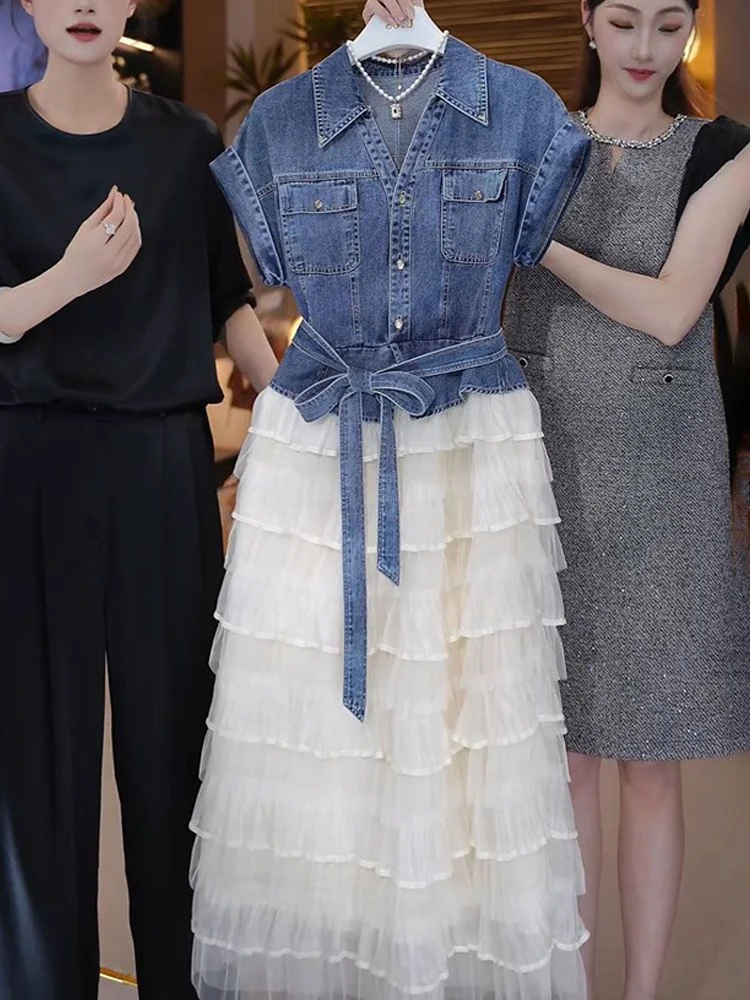 Tempérament haut en jean avec ceinture dentelle maille jupe deux pièces ensemble coréen banlieue Style mode à manches courtes robe ensembles pour les femmes