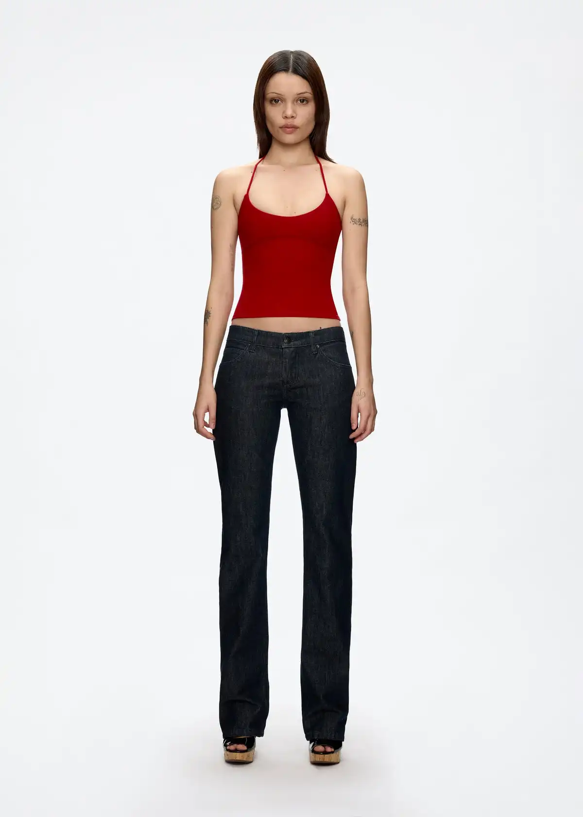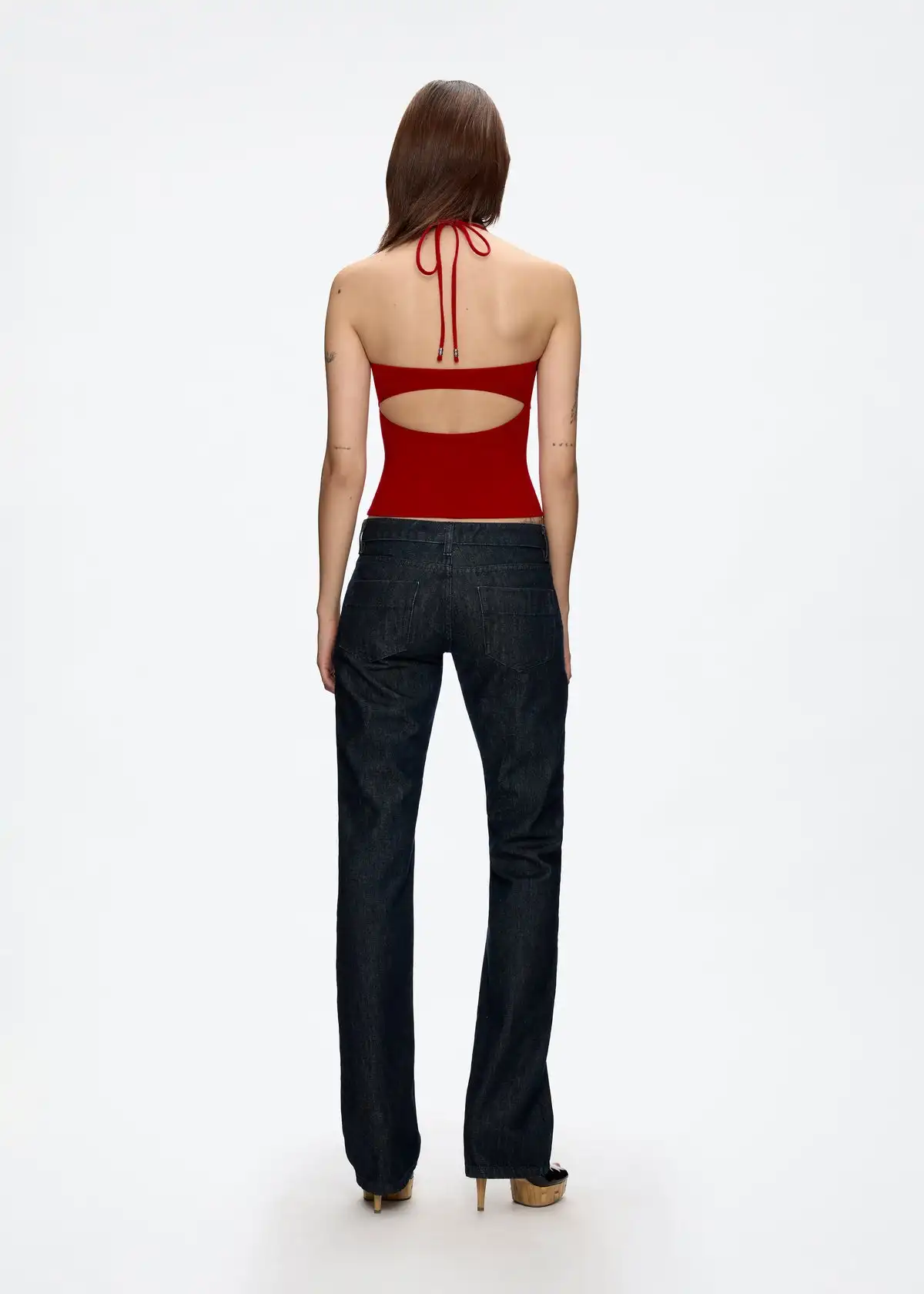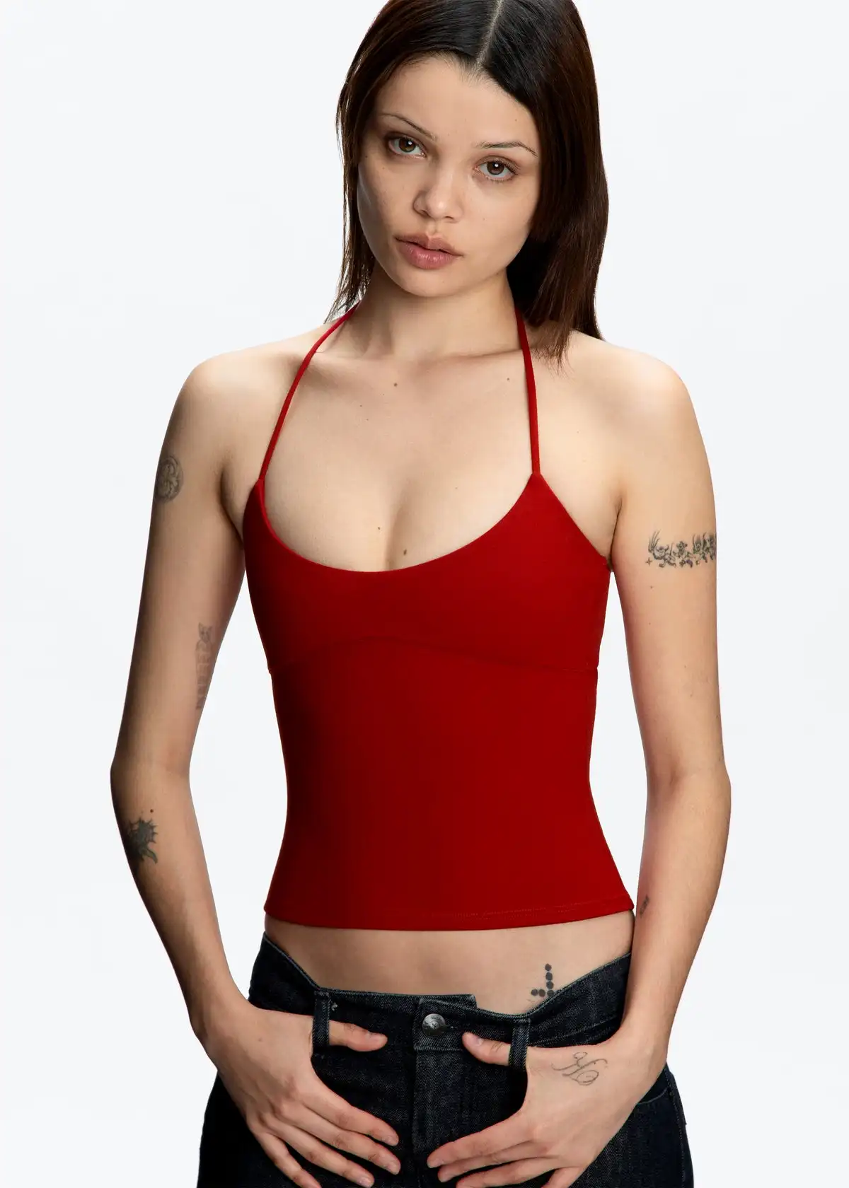 Débardeur Camisole extensible rouge à dos ouvert pour femme avec accessoires en métal et bretelles auto-cravate, haut licou sexy à col bas