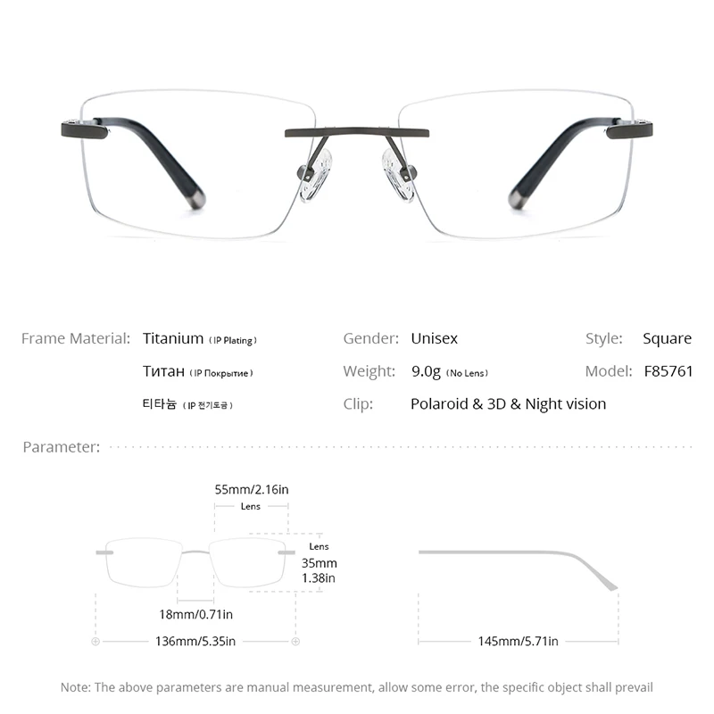FONEX Titanium Glasses Frame Men Square Magnet Clip on Rimless Eyeglasses 3D Night Vision Polarized Lens Japanese Eyewear 85761