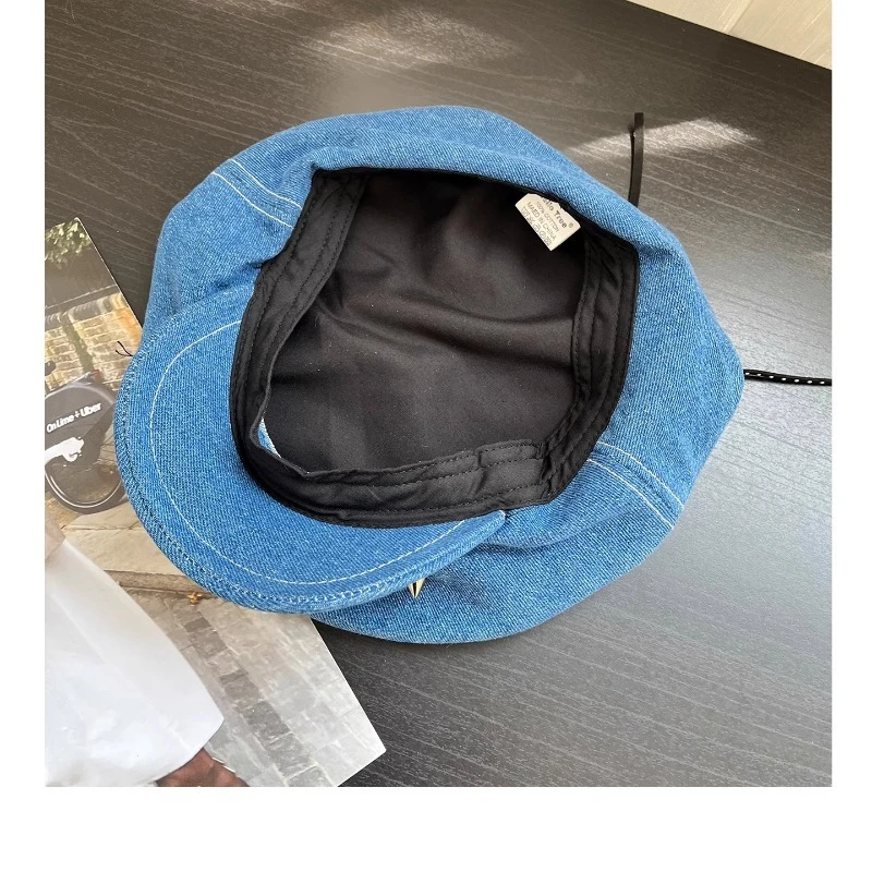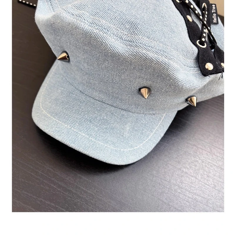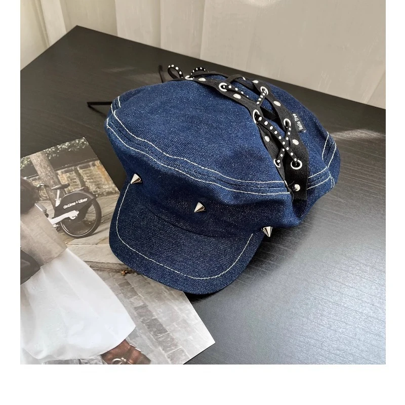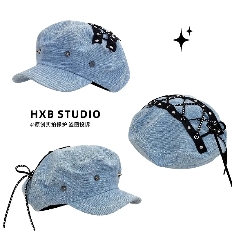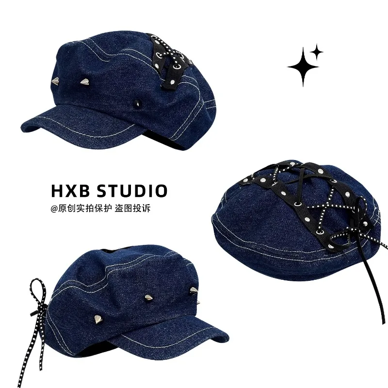 Personalized Y2k Punk Rivet Interspersed Strap Denim Octagonal Newsboy Hat Spring and Summer Large Version Sunshade Painter Hat