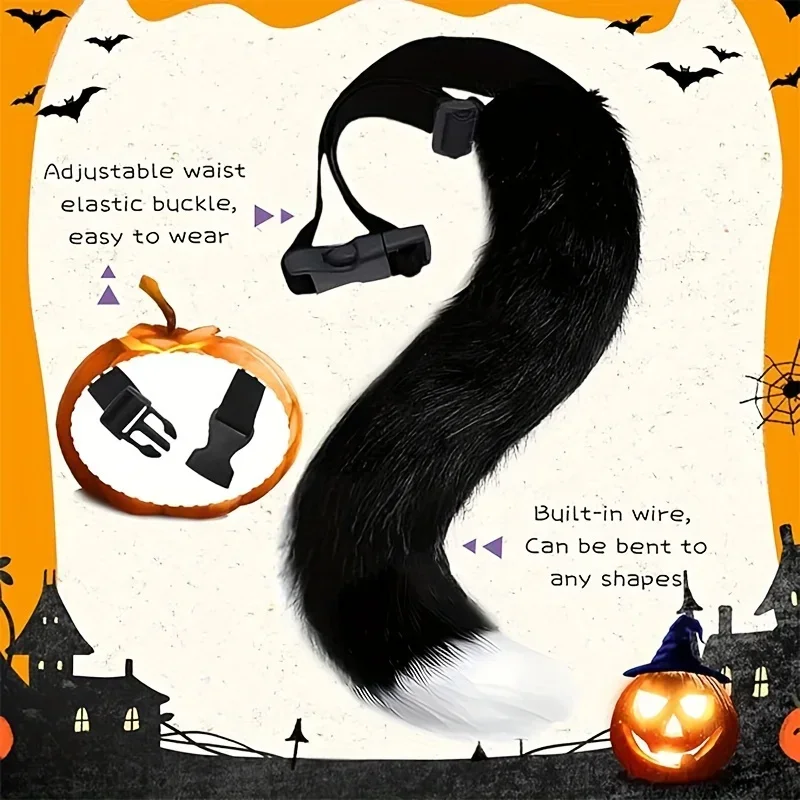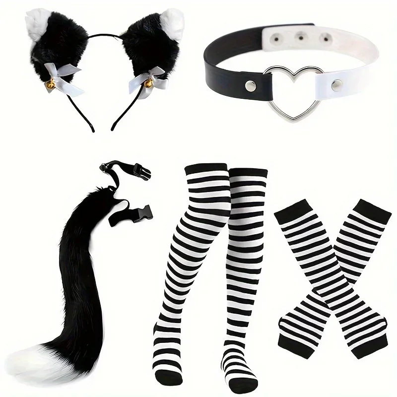 Role playing costume set with black and white stripes, furry tail, gloves and socks, acting props for Halloween