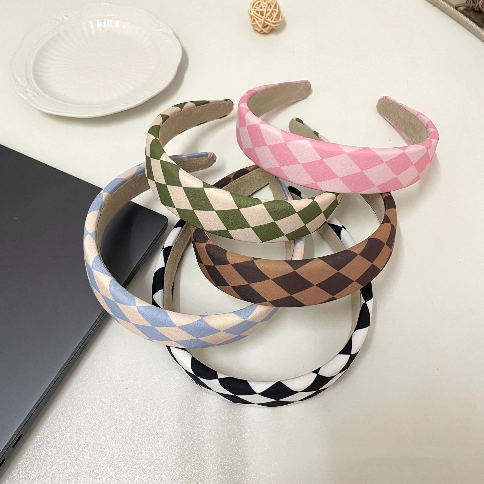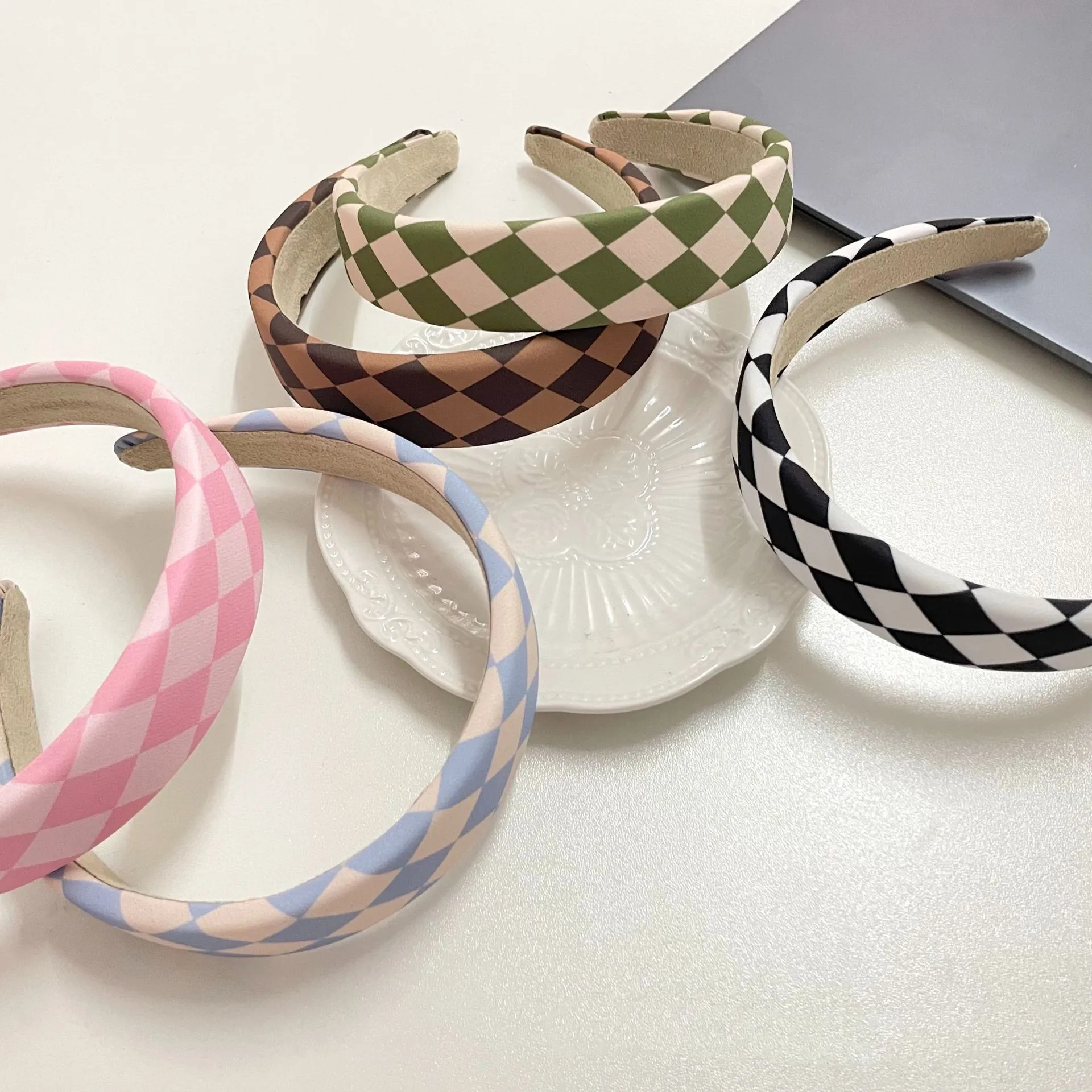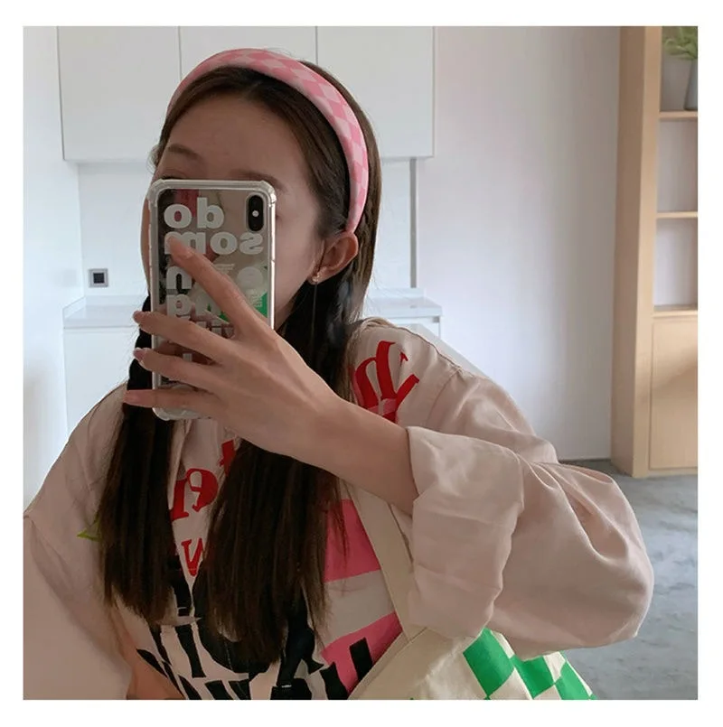 Vintage Wide Padded Rhombus Plaid Hairband Simple Flat Patchwork Headband Comfy Bezel Hair Hoop Accessories For Women Girls