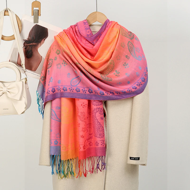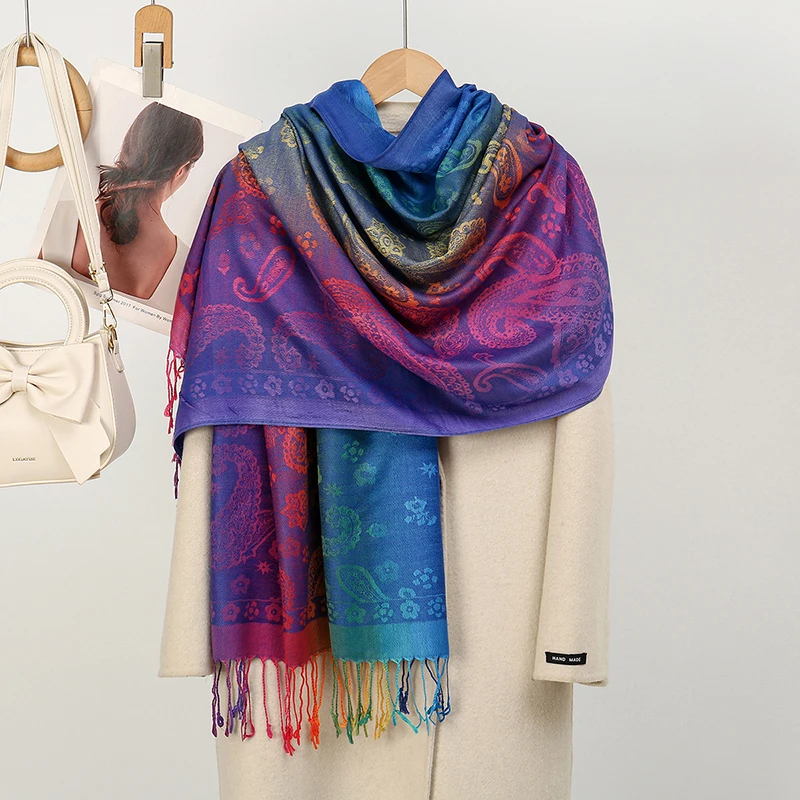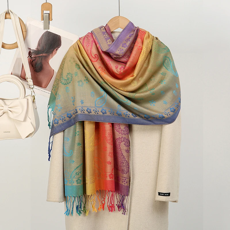 Boho Elegant Jacquard Pashmina Imitation Cashmere Scarf Winter Thick Warm Rainbow Color Shawl Wrap Coldproof Blanket Scarf Stole