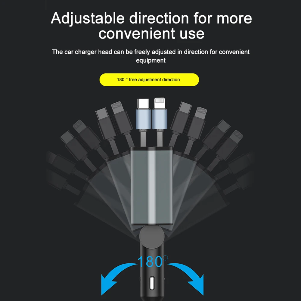 Car Phone Charger Adapter 120W USB Type C Fast Charger Cable with Retractable Cords Volt Display Fit for iPhone IPad Samsung