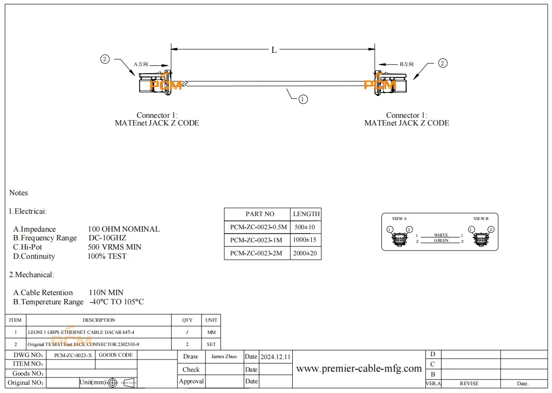 Original TE MATEnet Automotive Ethernet Cable 100/1000BASE-T1 Media Converter MATEnet Cable Z Code Female to Female 2302510-9