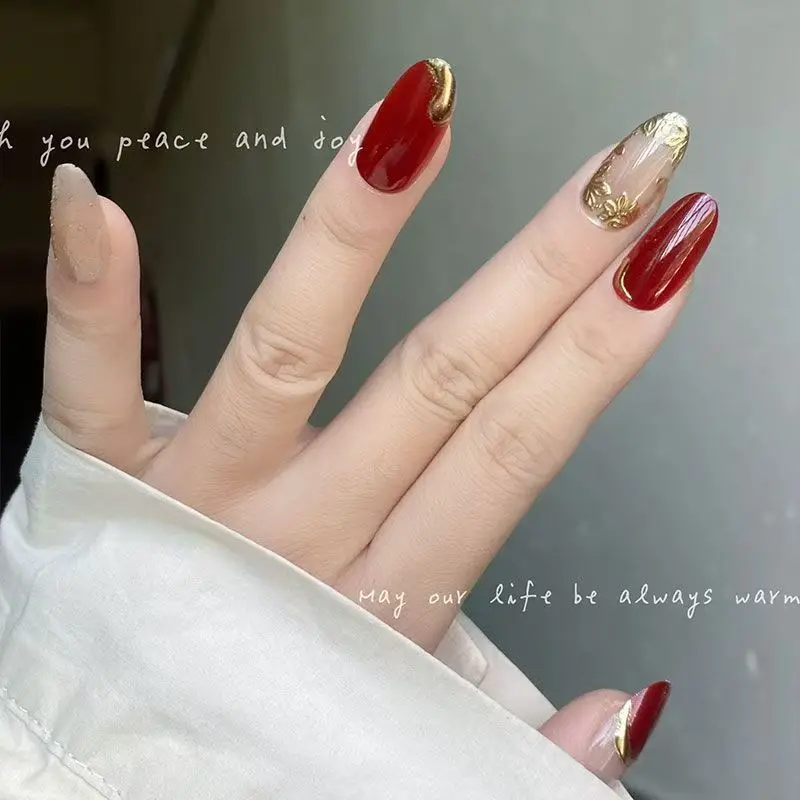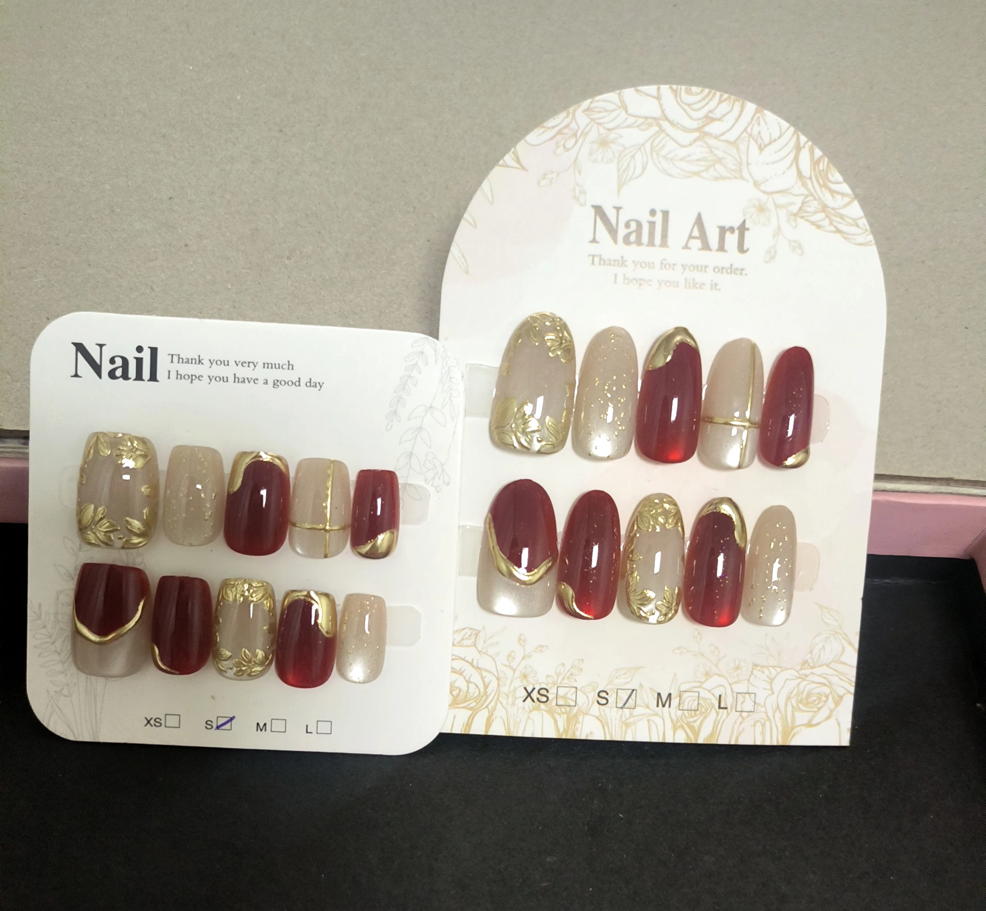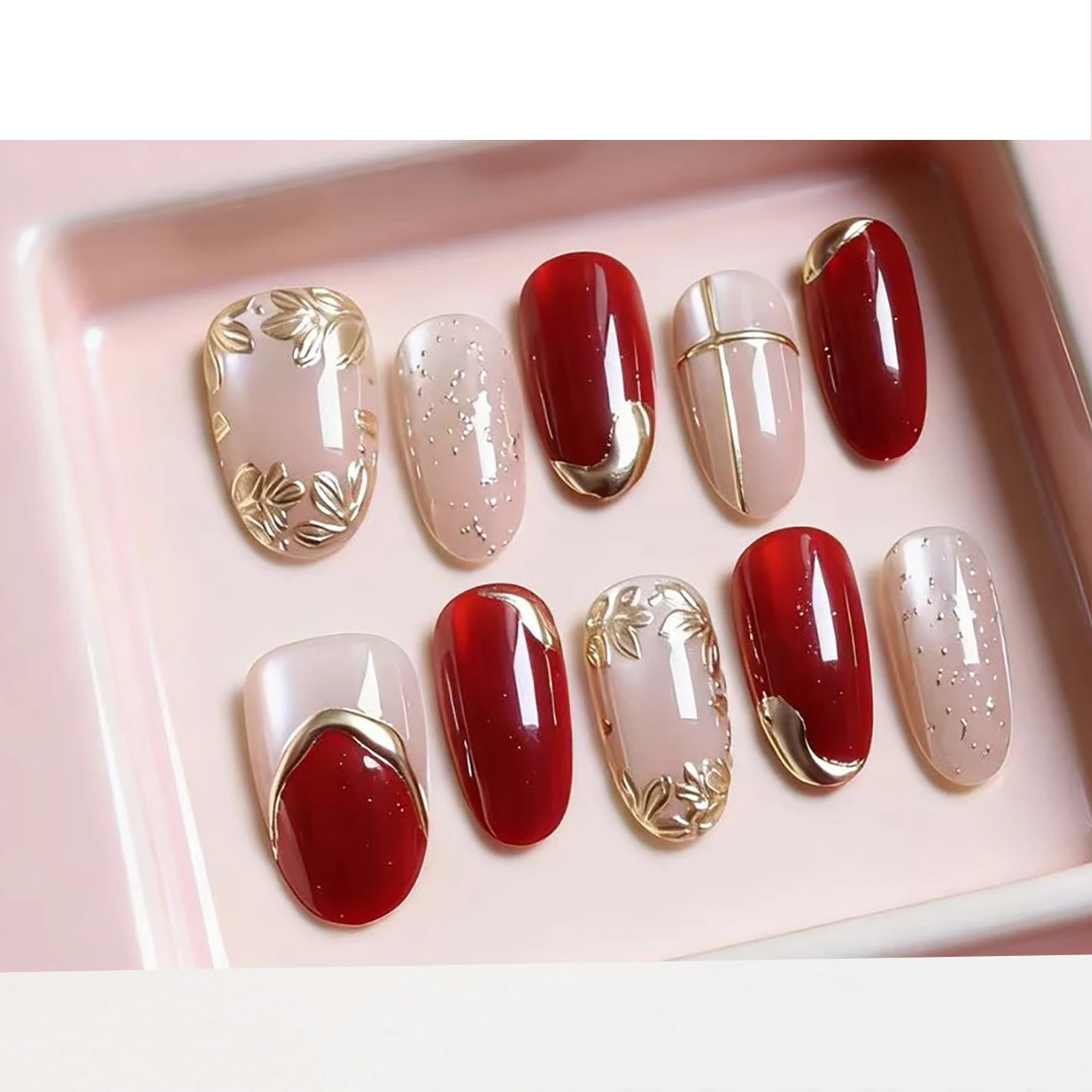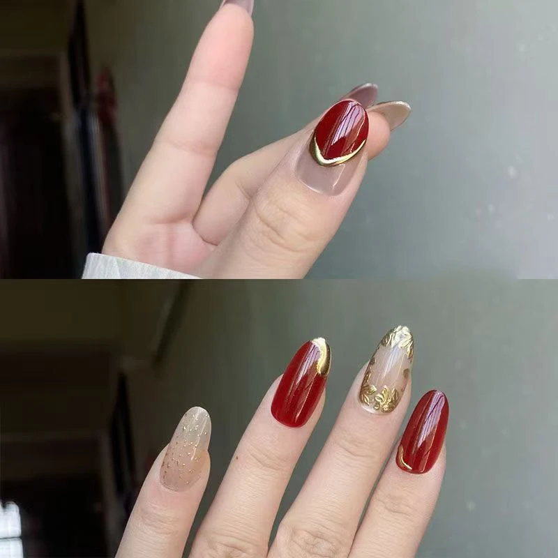 10pcs Almond Cat Eye Gilt Press On Short Square Nails Icy Clear Shiny French Metallic Lines Flower Design Reusable False Nails