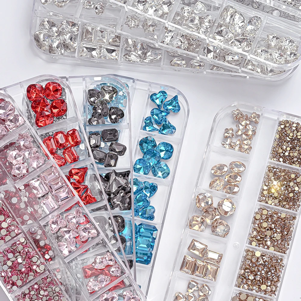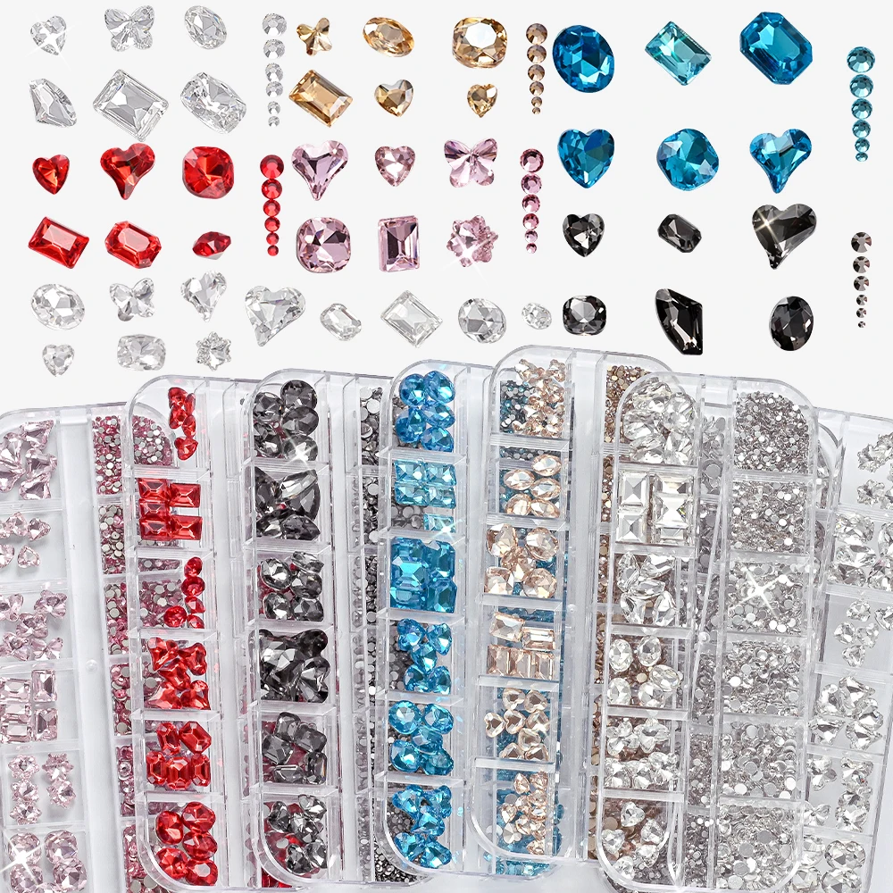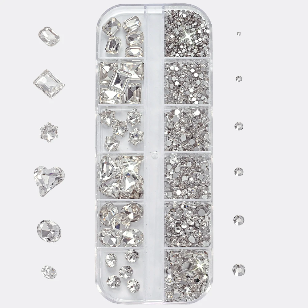 12Grids 3D Clear Glass Mutil-Shapes Nail Rhinestones + SS6-SS16 Round Diamond Crystals Luxury Heart Square Nail Art Gems Decorat