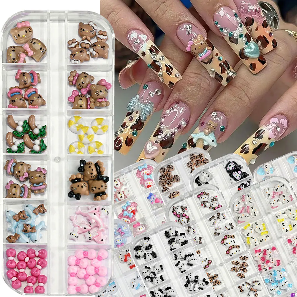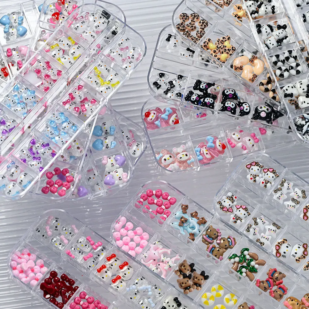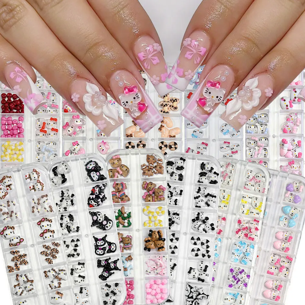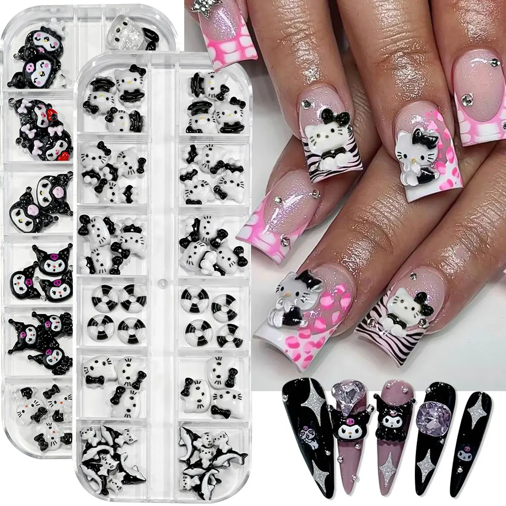 12Grids Summer Black Skin Hello Kitty Nail Charms 3D Pink Bows Hello Kitty Nail Art Rhinestone Cute Cartoon DIY Nail Accessories