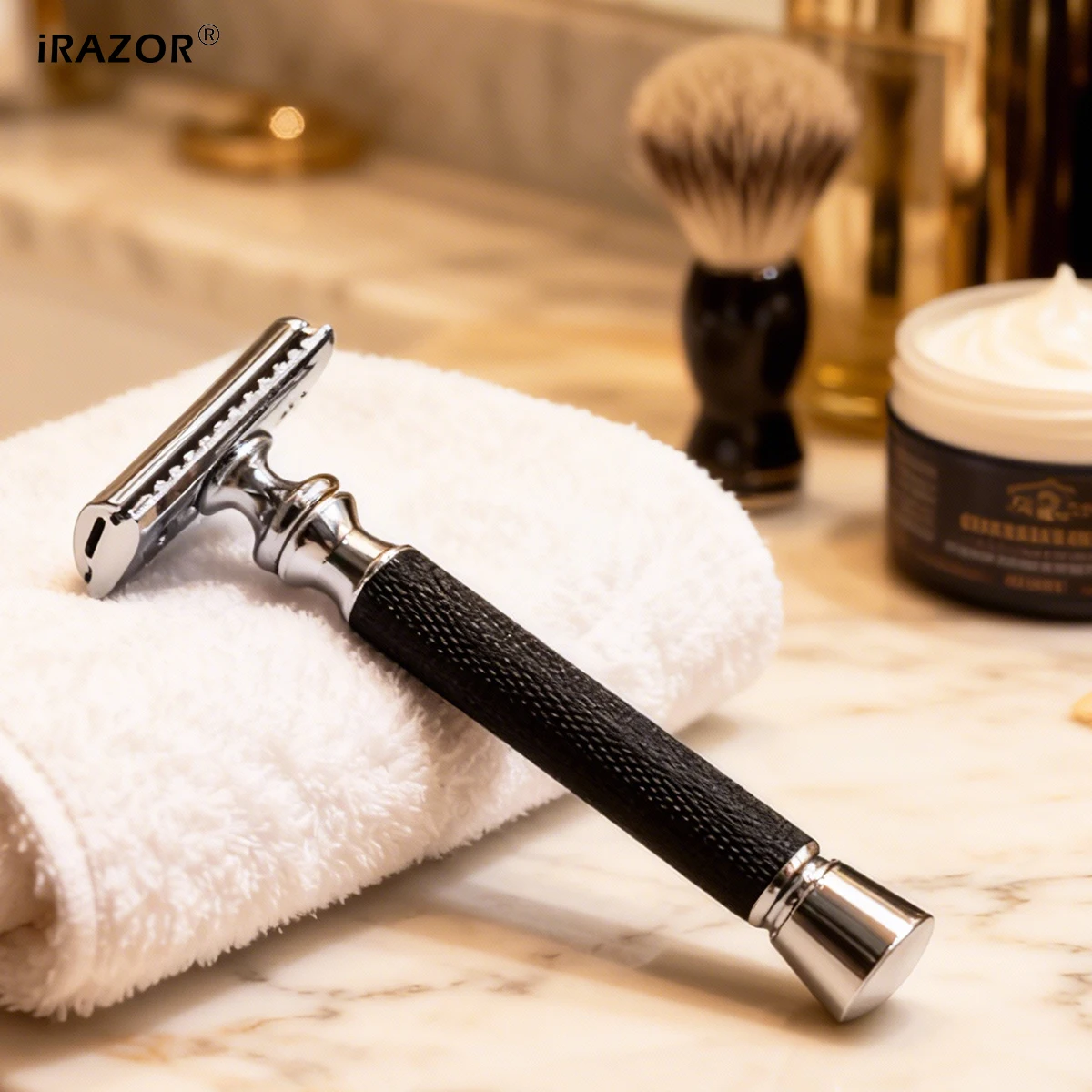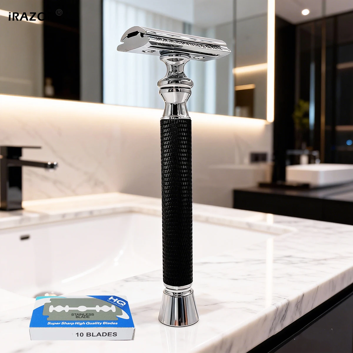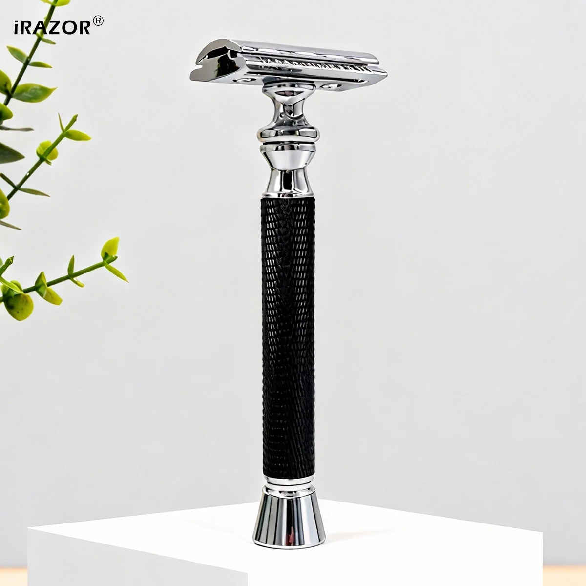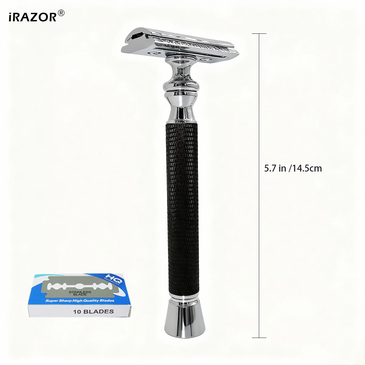 iRAZOR Classic T-Shaped DE Double Edge Safety Razor for Men Black Textured Non-Slip Shaving Machine Ideal Christmas Gift