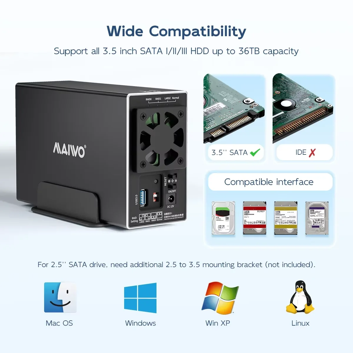 MAIWO 2.5/3.5 Inch SATA RAID HDD Docking Station USB 3.0 2 Bay External Hard Drive Case with 4 RAID Modes Support 48TB Capacity