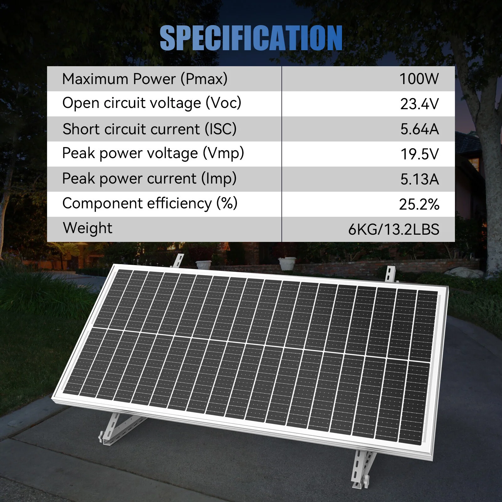 12V system, Pmax 100W, Vmp 19.5V, Imp 5.13A, Voc 23.4V; rigid panel.