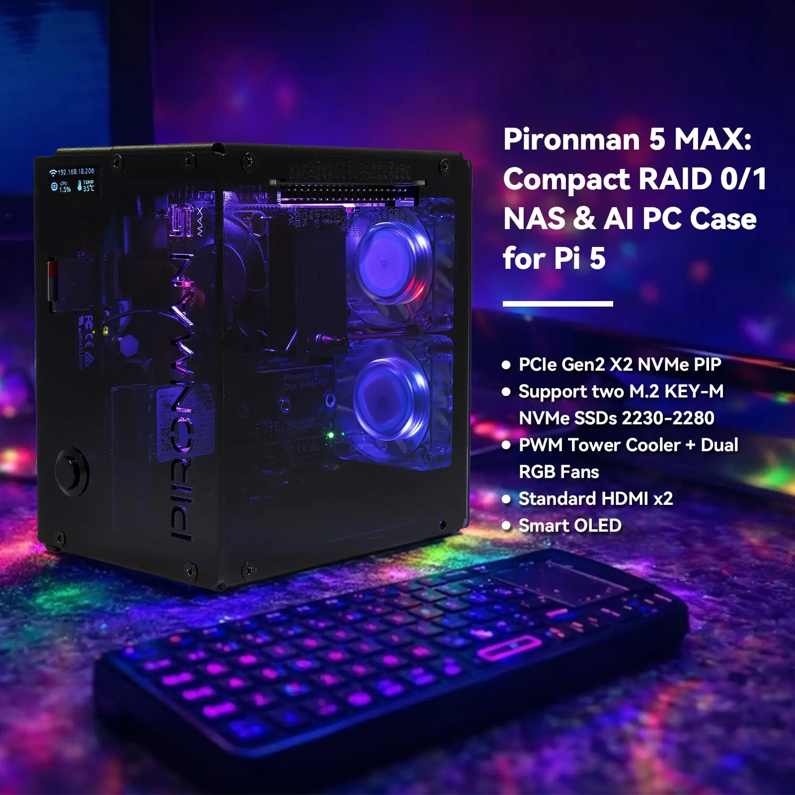 Pironman 5-MAX Dual NVMe M.2 SSD PCIe PC Case for Raspberry Pi 5 NAS RAID 0/1 Hailo-8L AI Accelerator,Safe Shutdown,HDM (No Pi5)