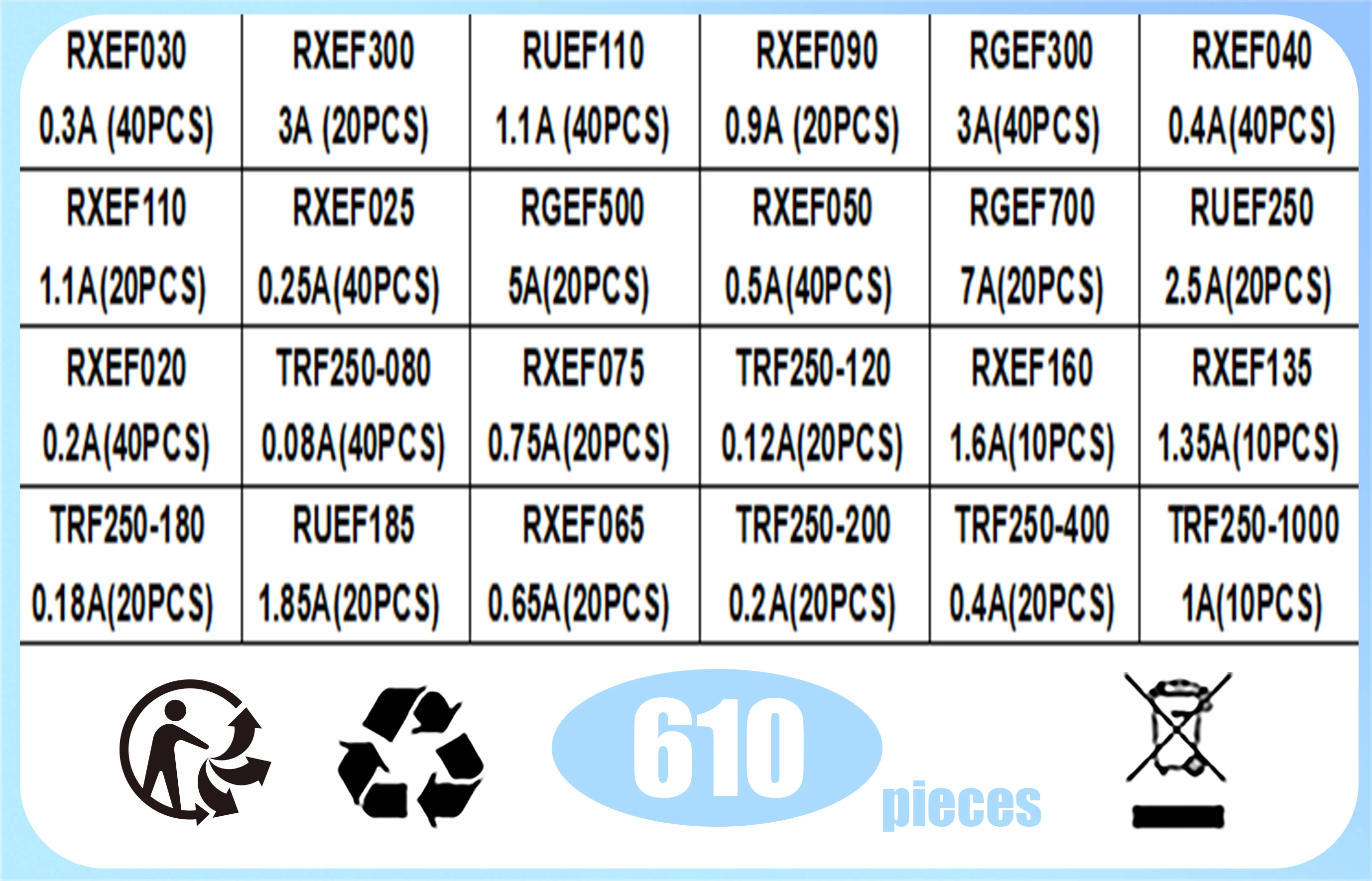 610PCS 24values Self-Recovery Fuse Assorted PPTC KIT 0.05A 0.1A 0.2A 0.25A 0.3A 0.4A 0.5A 0.75A 0.9A 1.1A 1.35A 2A 2.5A 3.75A