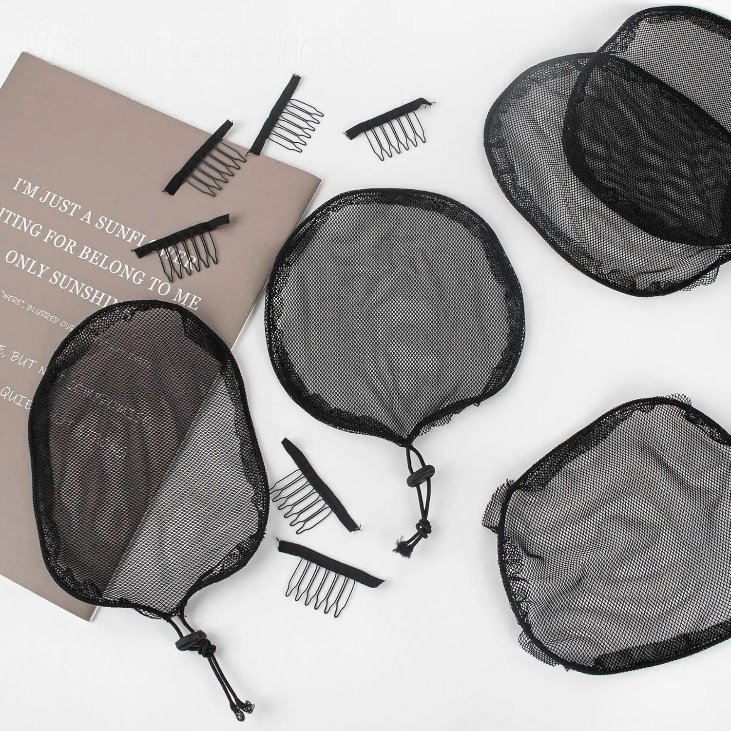5 Pieces Black Weaving Net Cap Elastic Drawstring Ponytail Hair with 3pcs Mesh Clips for Making Afro Puff Bun Wig Tools Women