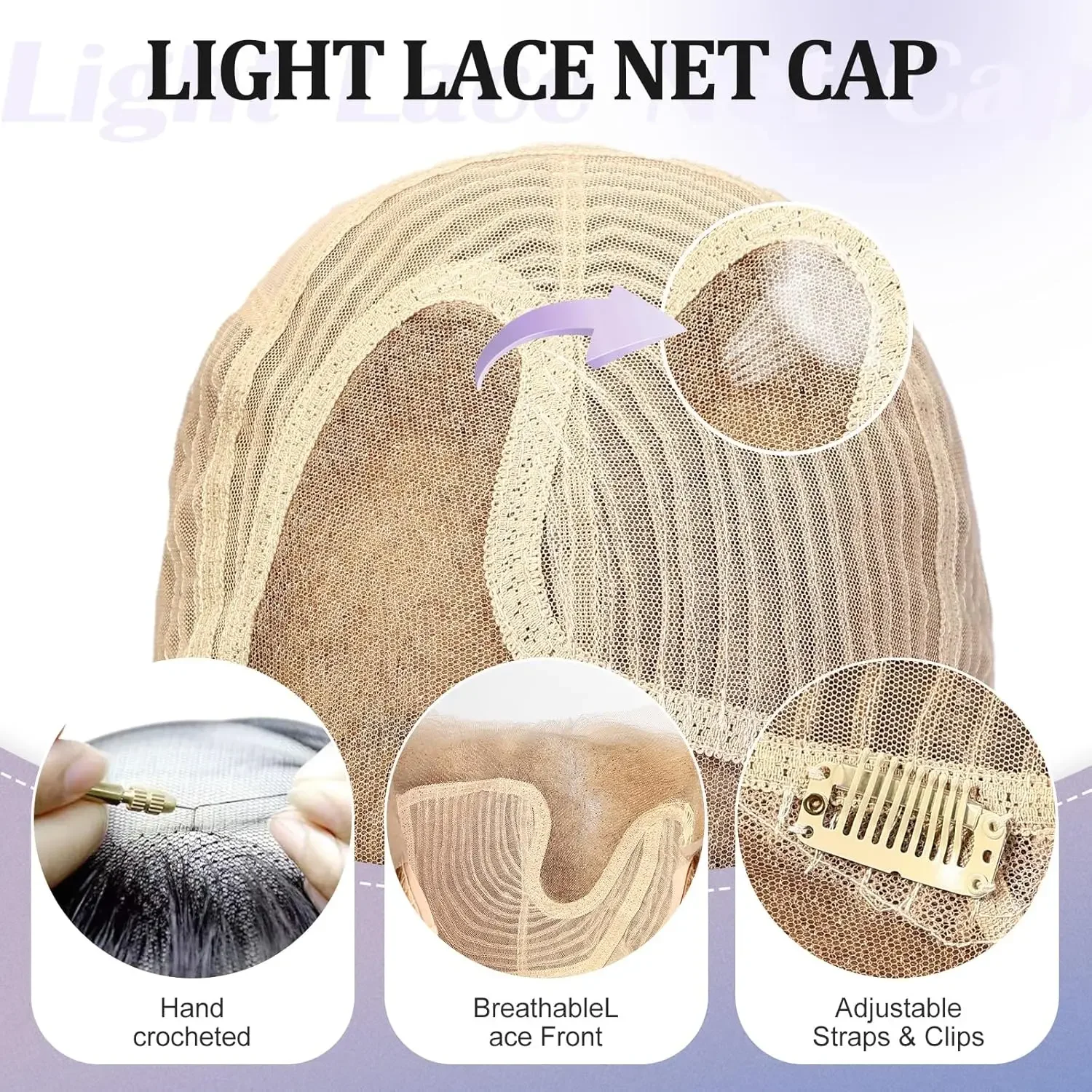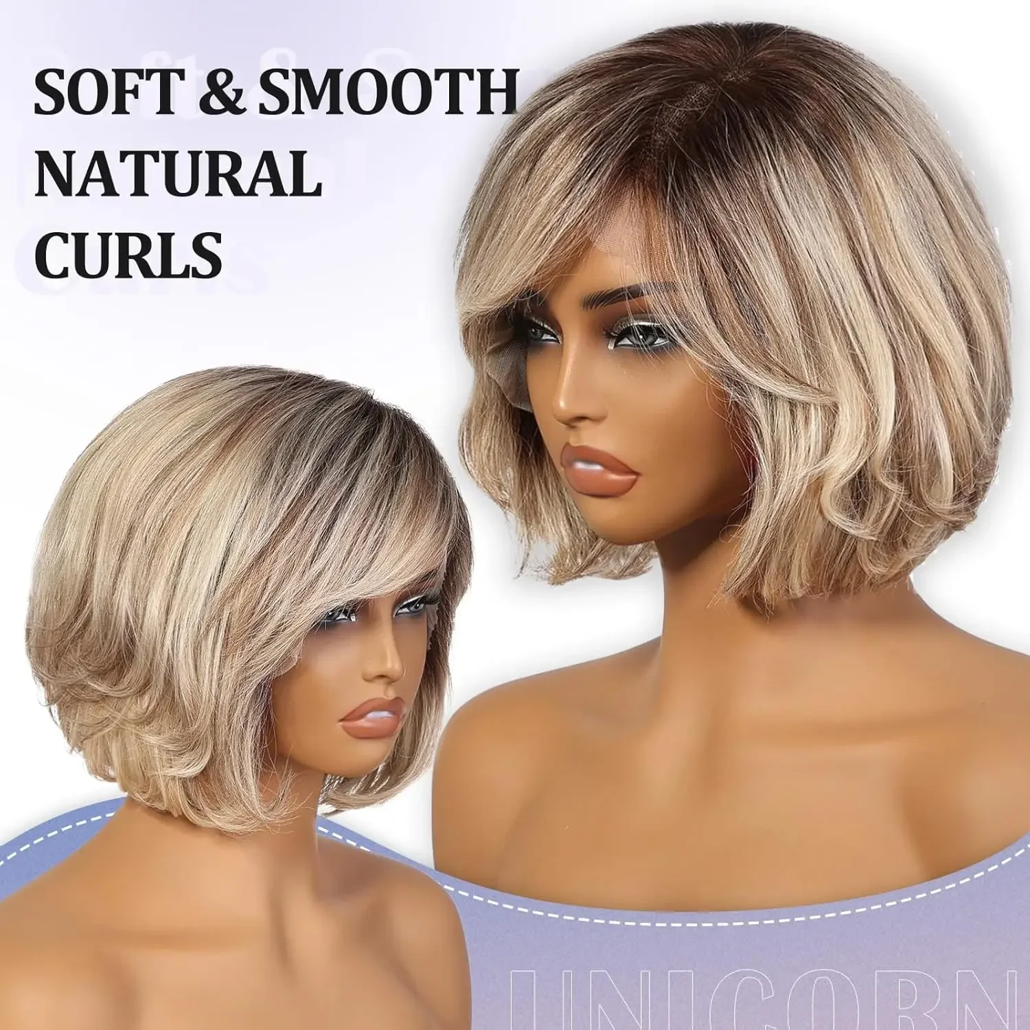 Short Layered Wavy Bob Wig with Bangs for Women Blonde Highlights Human Hair 12 inches HD Lace Front Wigs With Dark Roots