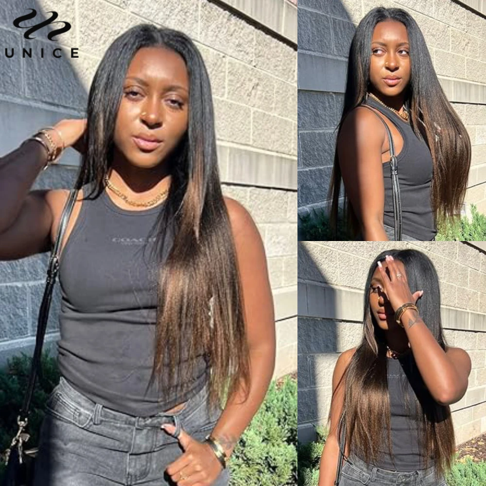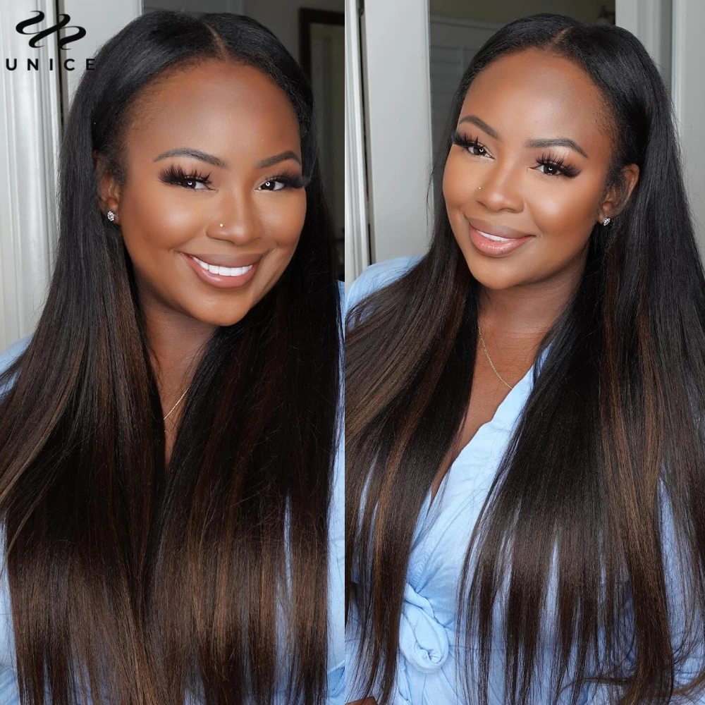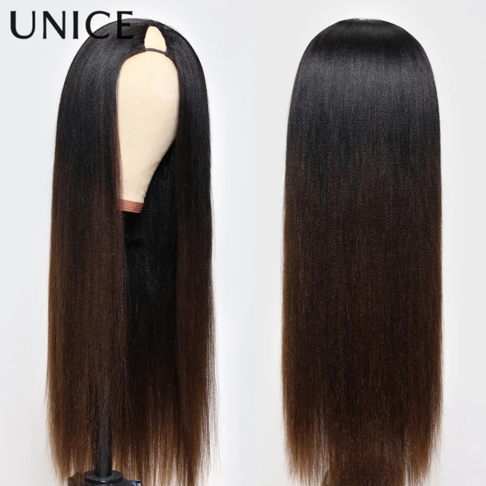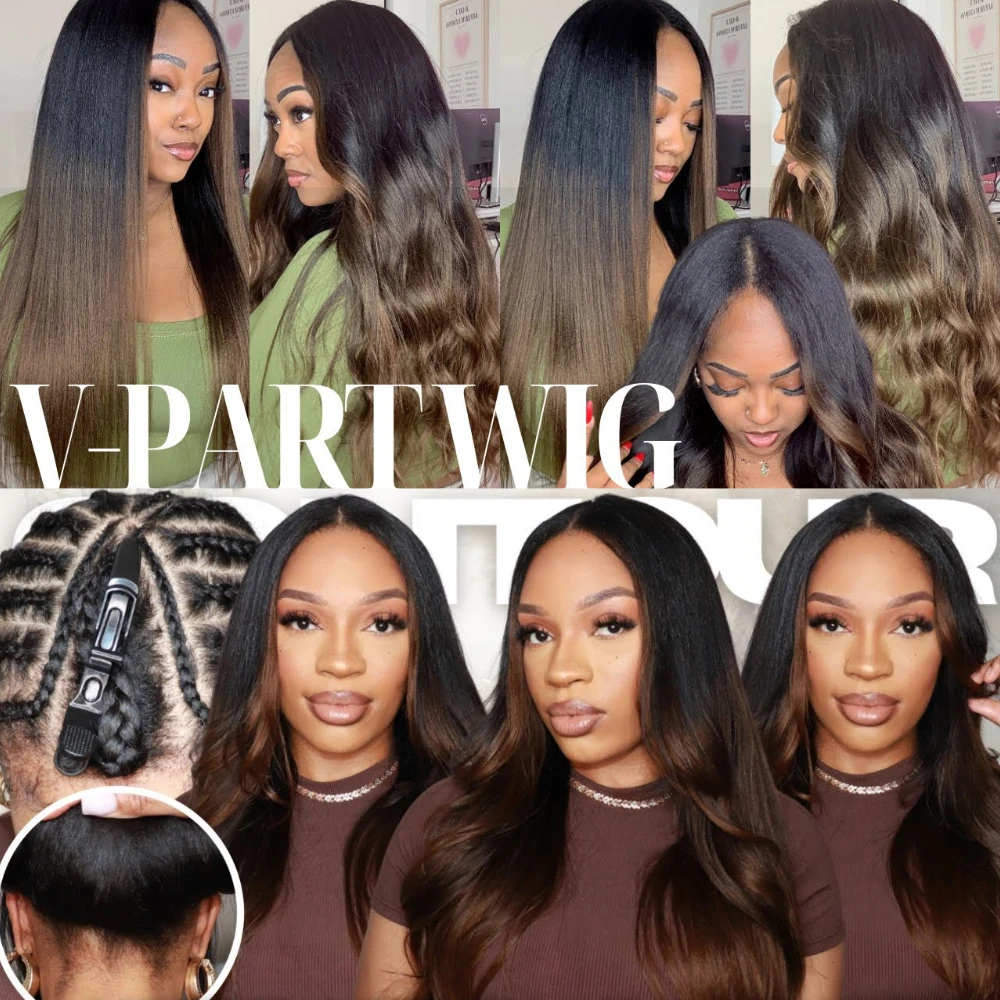 UNice Hair EasiContour Yaki Straight V Part Wig Ombre Brown Color 100% Human Hair Wig Minimal Leave Out Upgrade U Part Wig