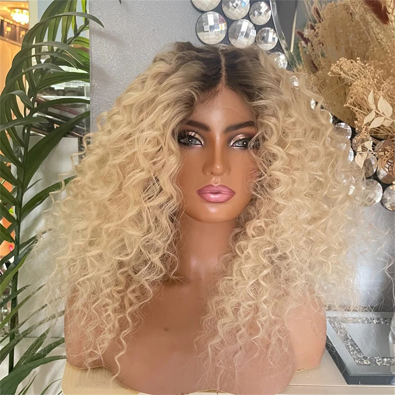 Deep Curly Honey Blonde Wig Short Dark Roots Synthetic Lace Front Wig For Women Daily Use Baby Hair Glueless Wig