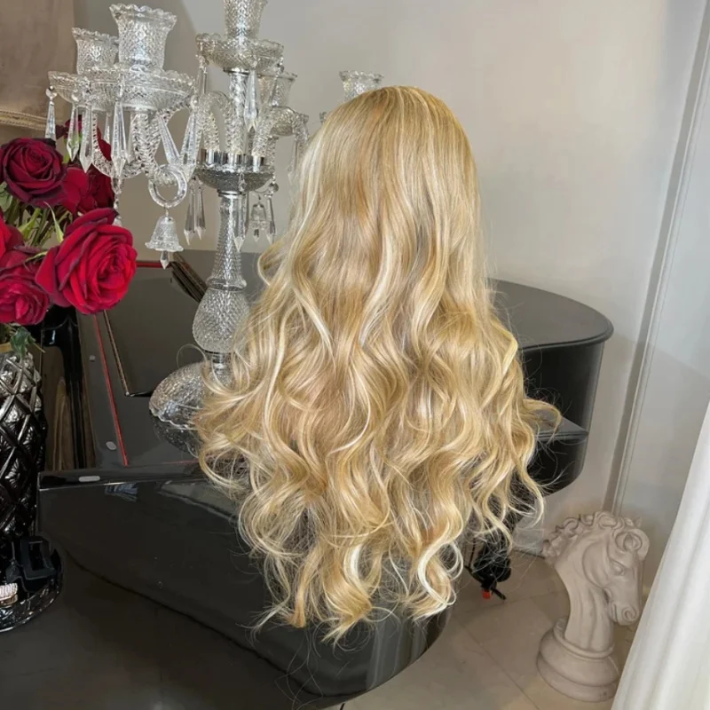 Light Blonde Lace Front Wig Synthetic Center Part Layered Heat Resistant Wig Dark Root Natural Soft Hairline Sunshine Gold Wig