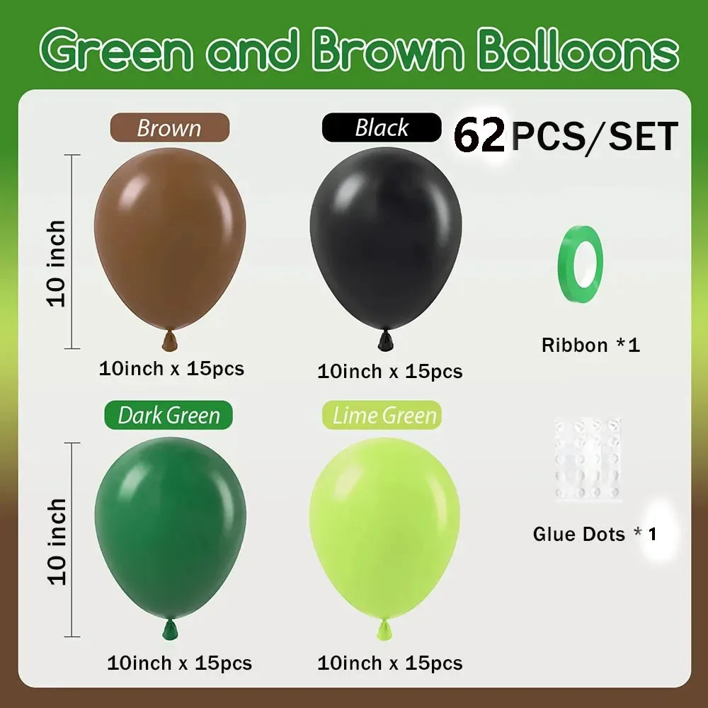 62pcs 10Inch Green Brown Balloons Set - Brown, Black & Dark Lime Green Balloons for Jungle Game Themed Birthday Party Decoration