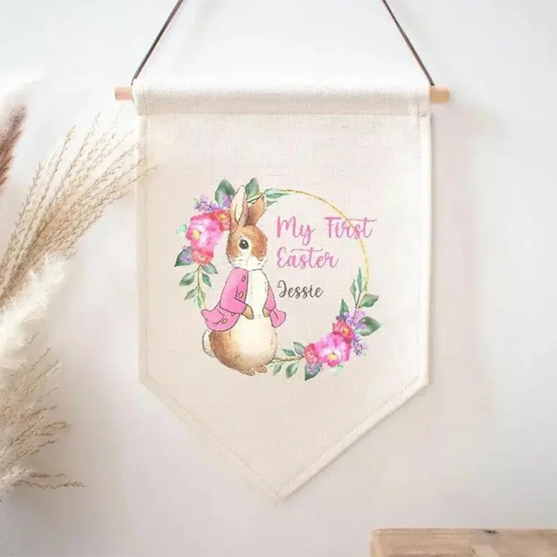 Personalised My First Easter Pink Blue Peter Rabbit Banner Egg Hunt Party Game Fireplace Mantle Wall Hanging Decorate Sign Gift