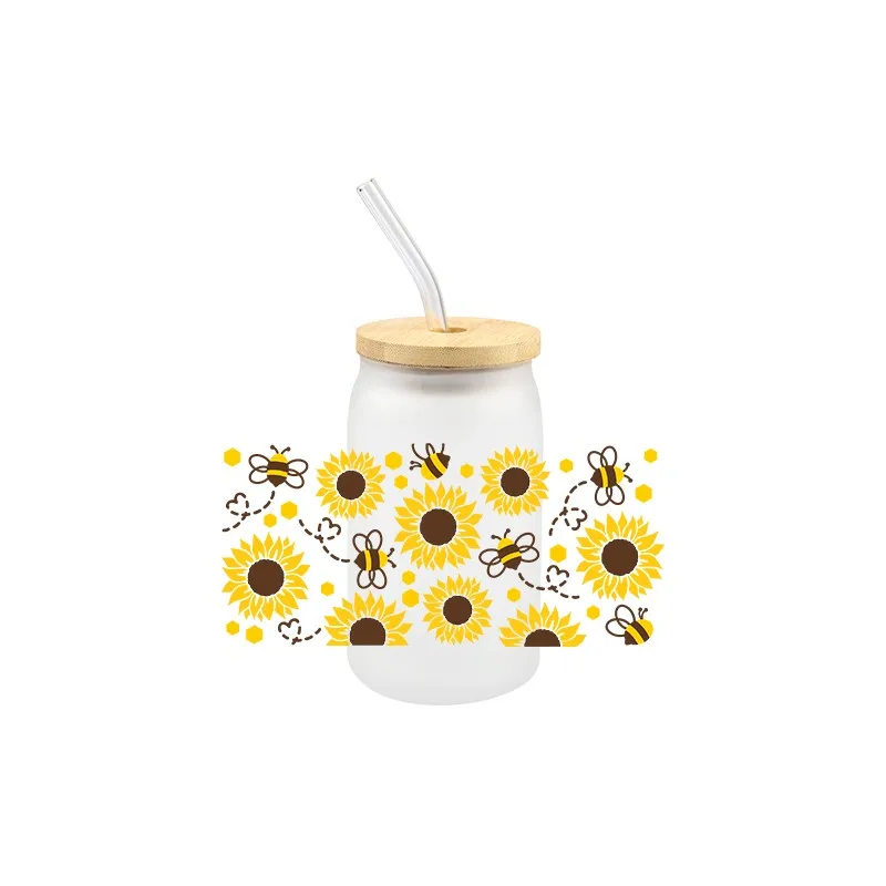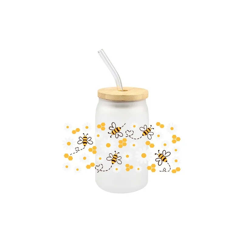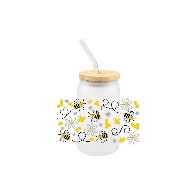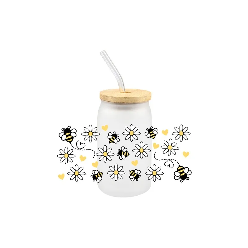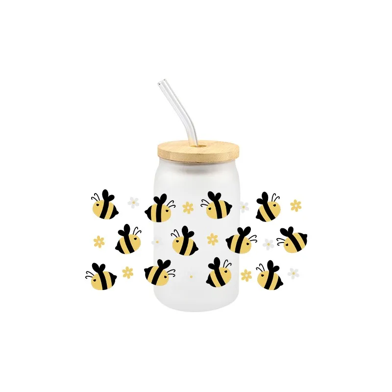 Bees Theme UV DTF Transfer Sticker Cartoon Cute Unique Decals For Wraps Cup Libbey Glass Cup Custom Design Sticker 3D
