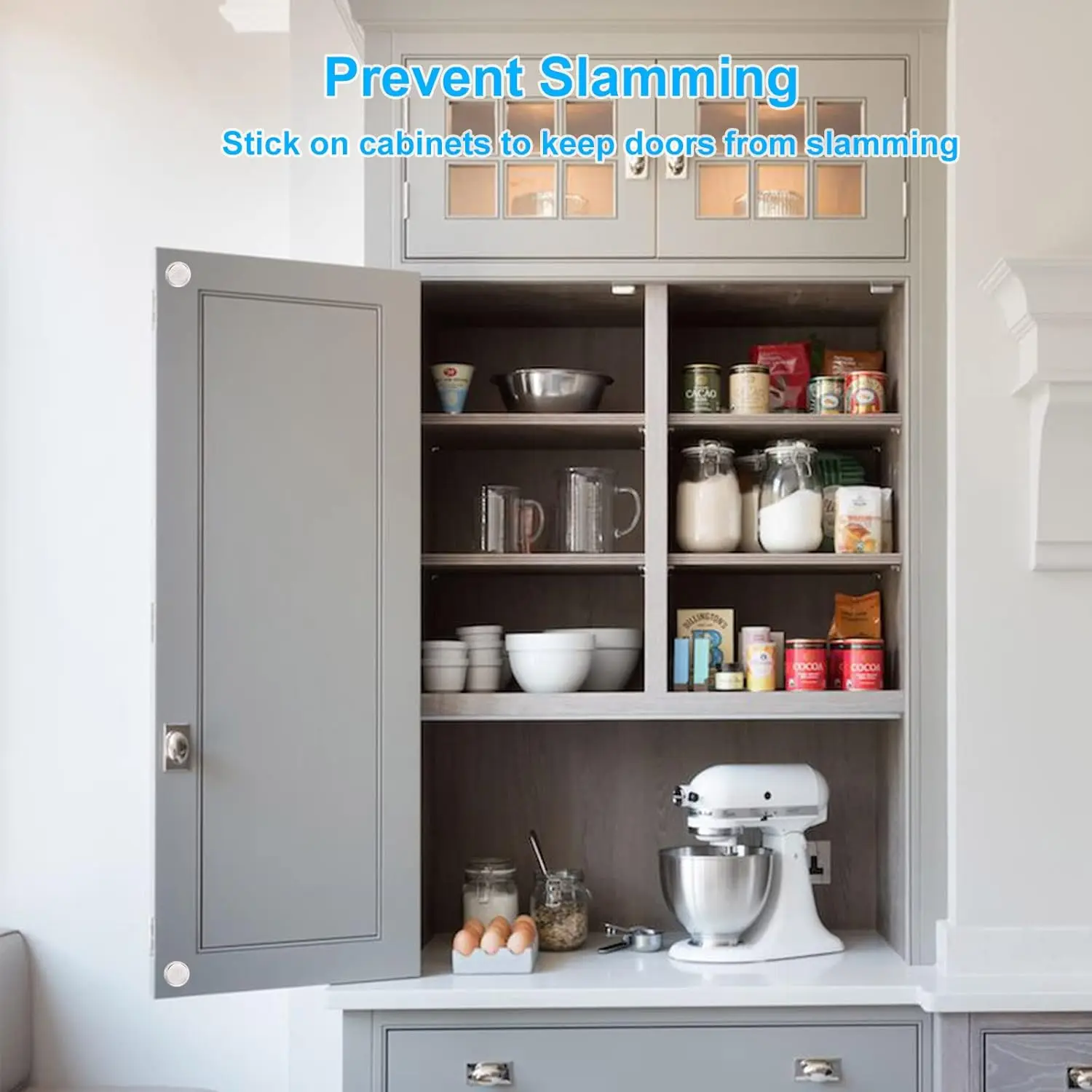 Peel and stick on door/cabinet contact points to cushion slams.