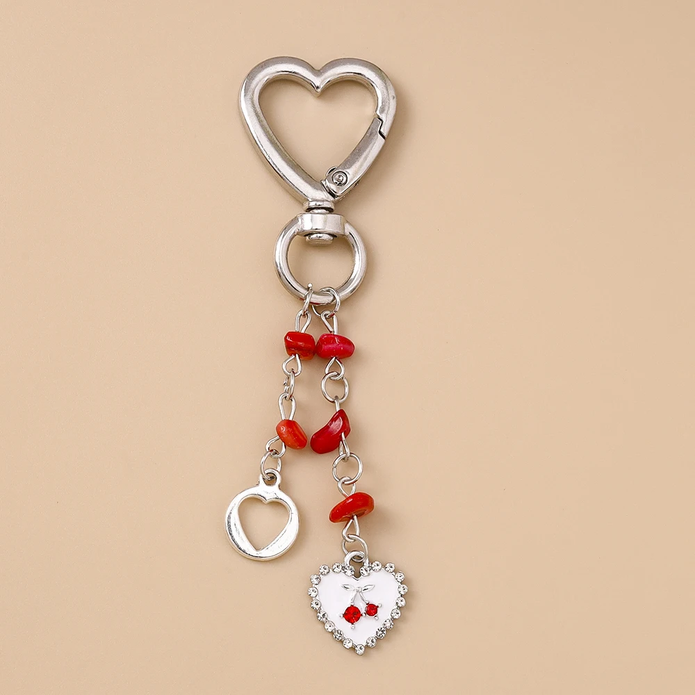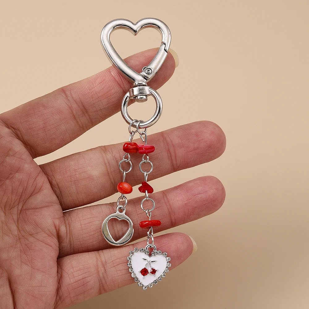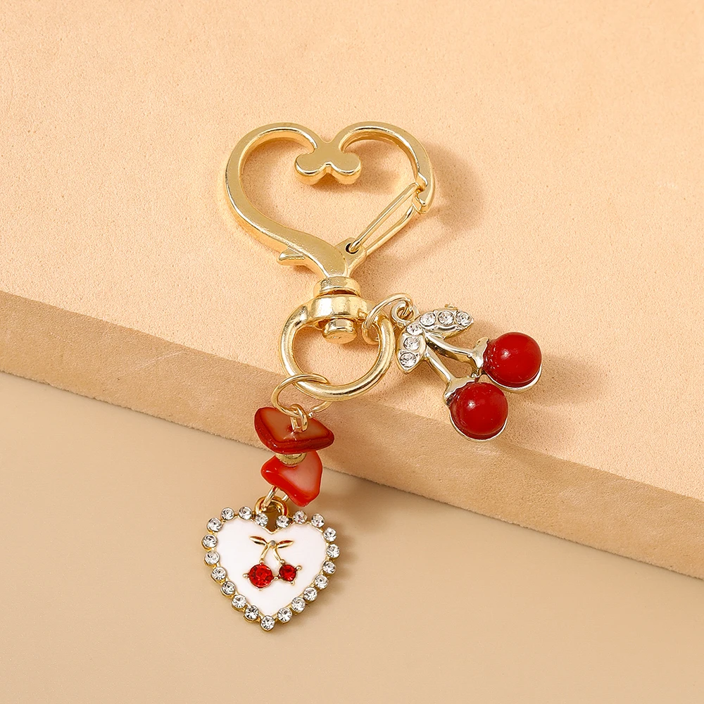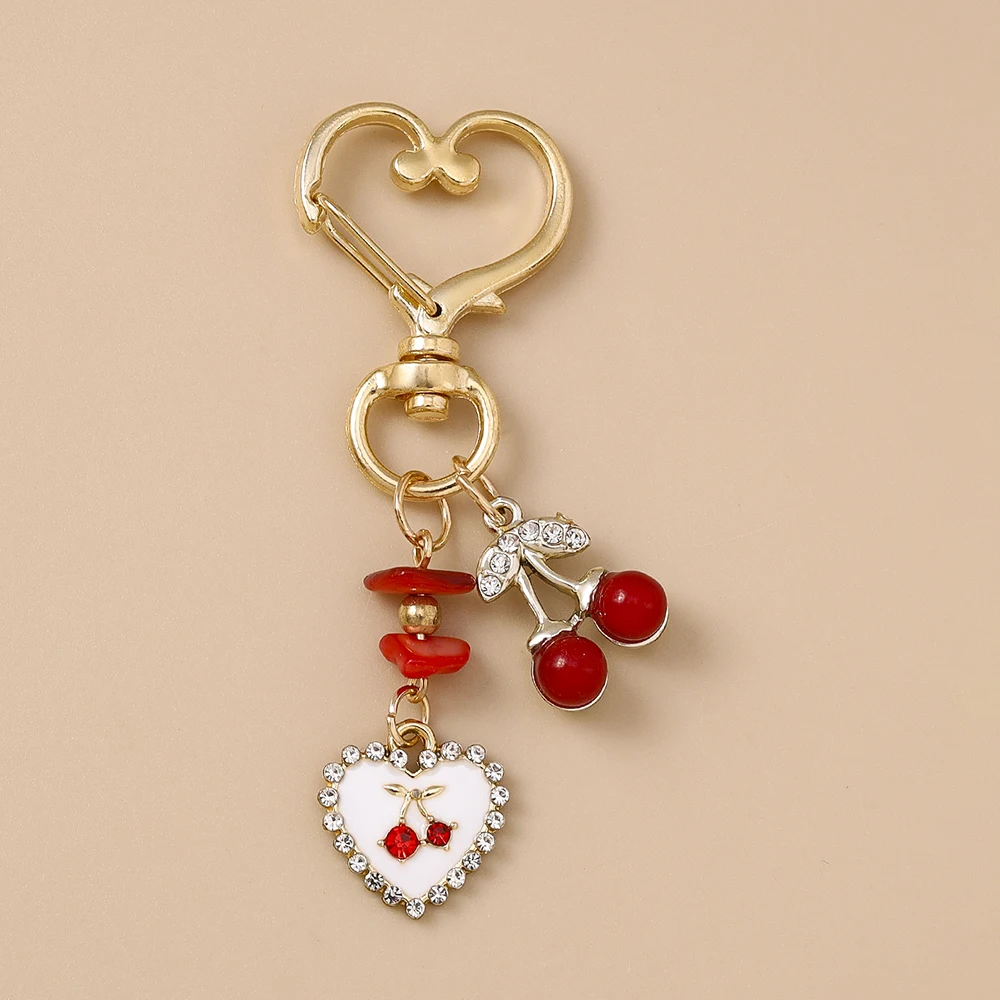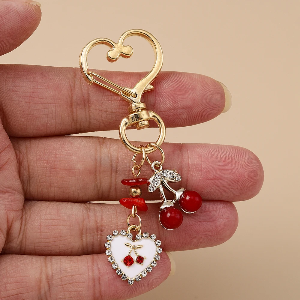 Aihua Exquisite Keychain Crystal Red Cherry Heart Pendant Keychain Rings for Women Men Bag Accessories Decoration