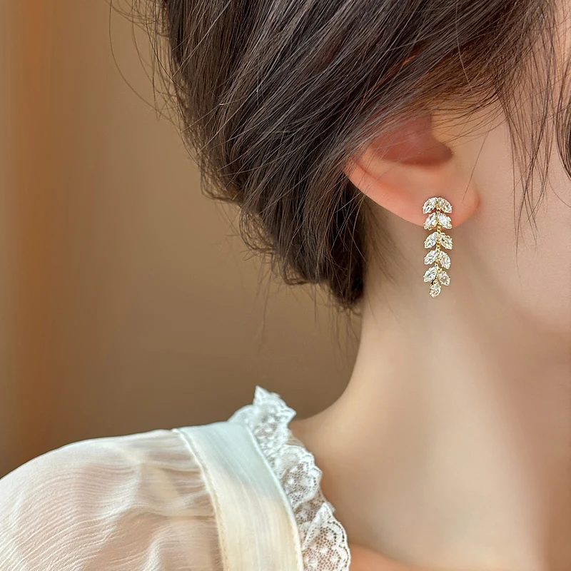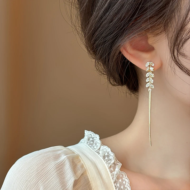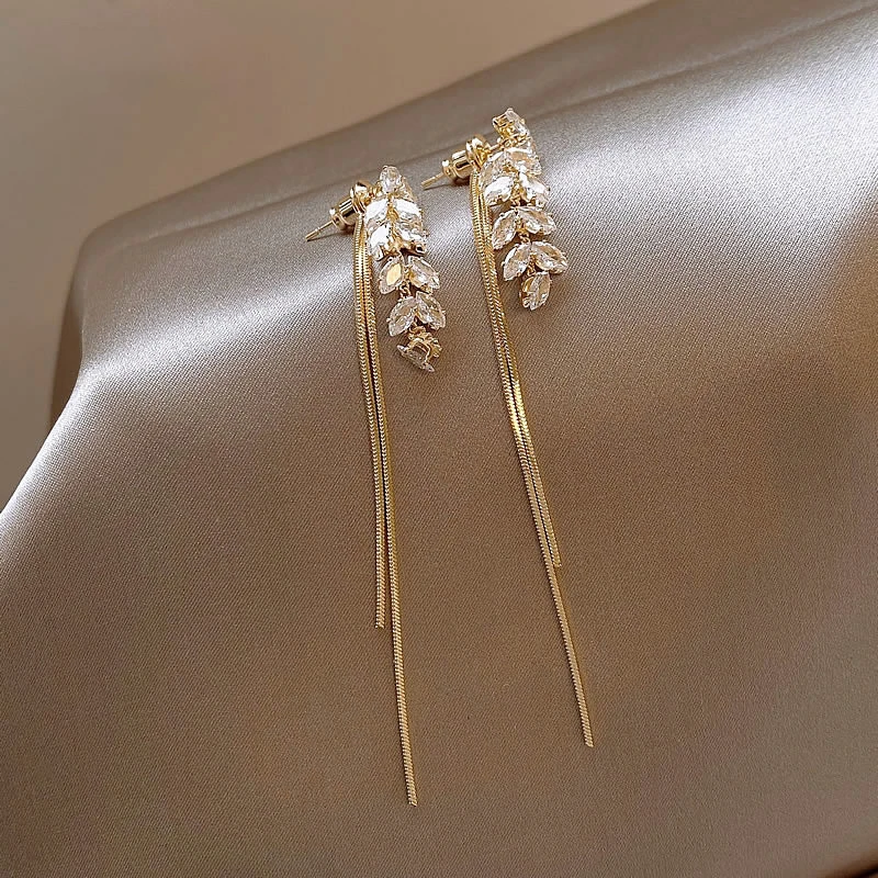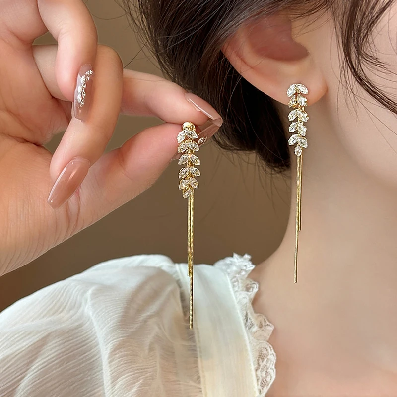 Girl’s Shining Zircon Wheat Tassel Hanging Long Gold Color Drop Earrings 2025 New Design Jewelry For Women's Trendy Accessories