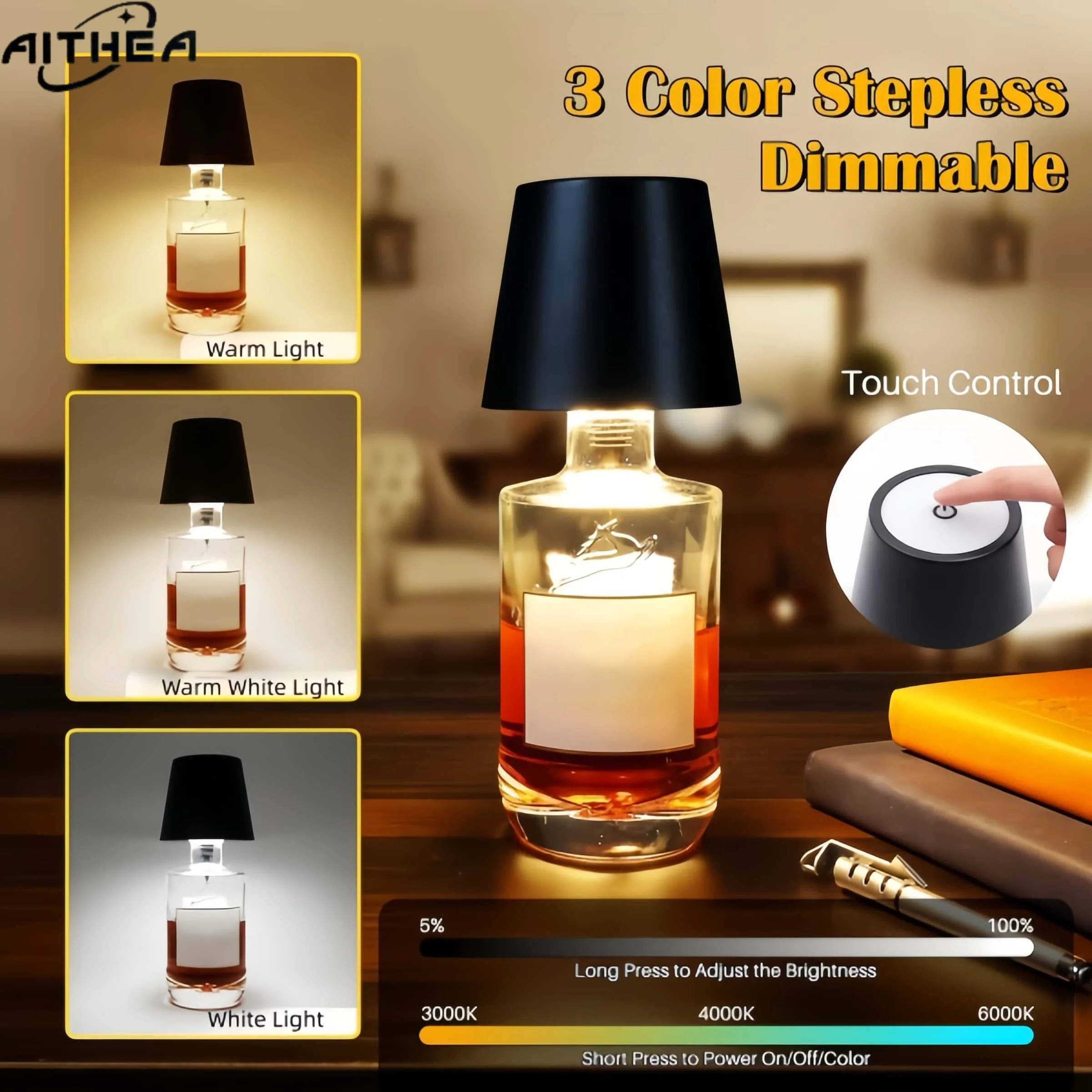 AITHEA Wireless Wine Bottle Cork Lamp Touch Control Dimmable LED Desk Light USB C Charging for Home Bar Decor