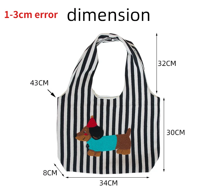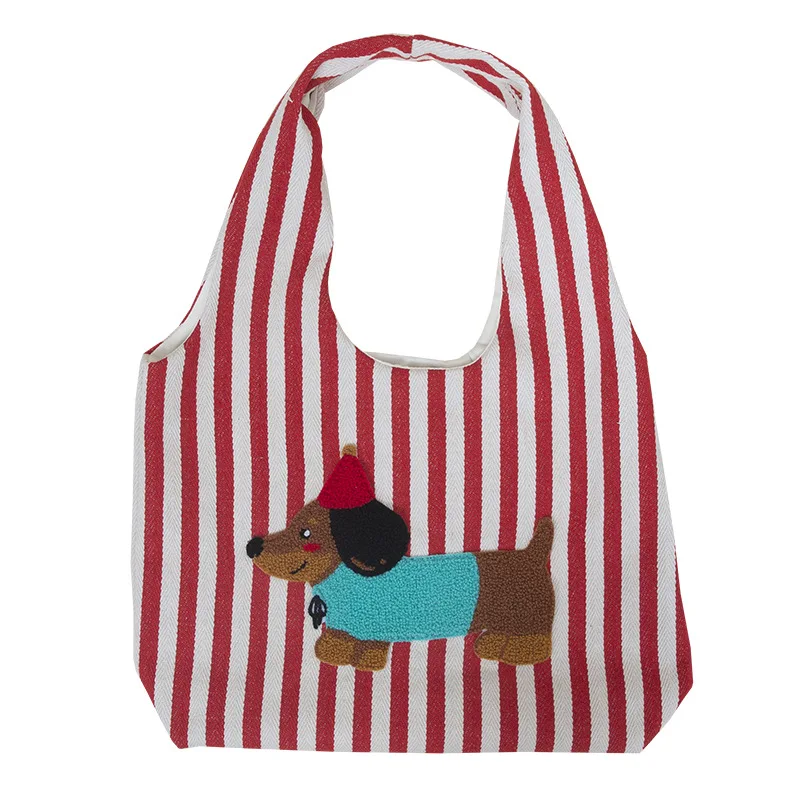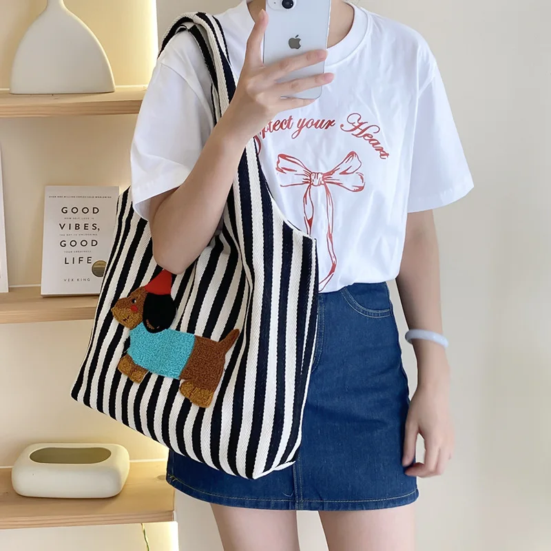 Cute Dog Embroidery Women's Shoulder Vest Bag Large Capacity Female Commute Shopping Bags Simple Striped Ladies Tote Handbags
