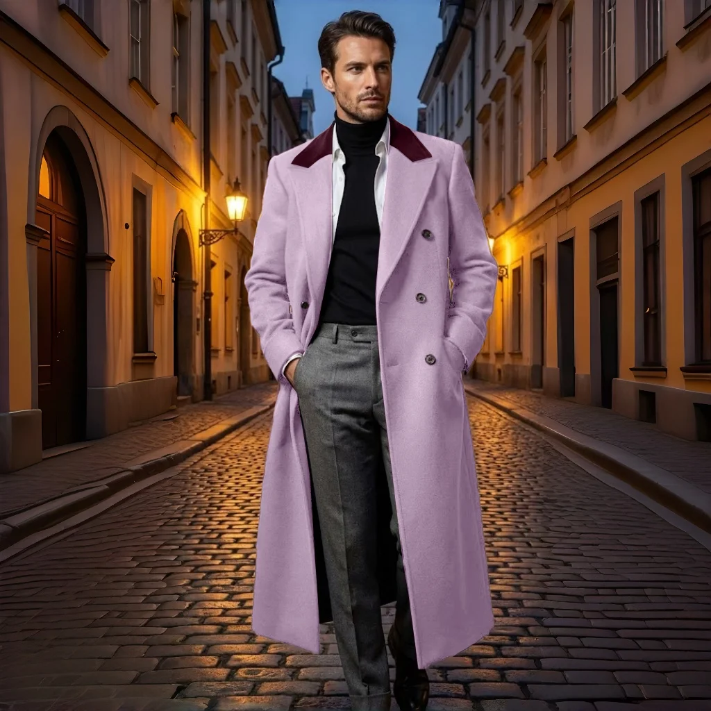 England style for men, winter applicable; double-breasted with turn-down collar.