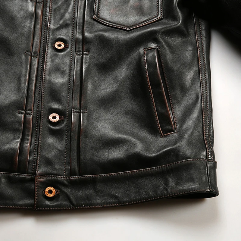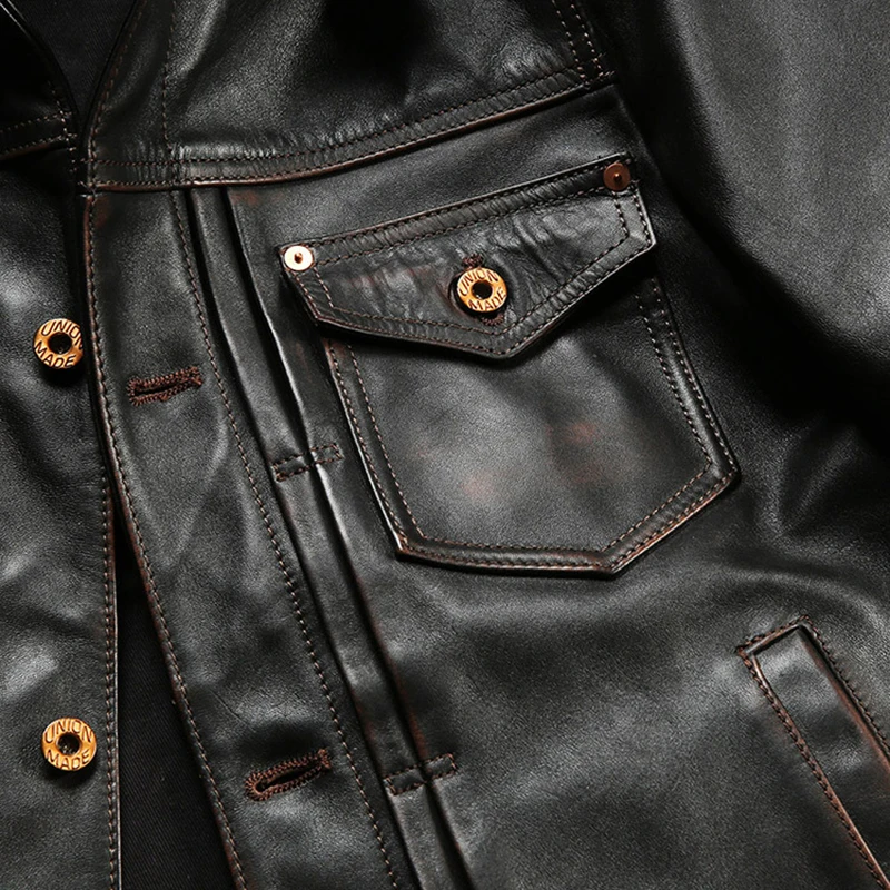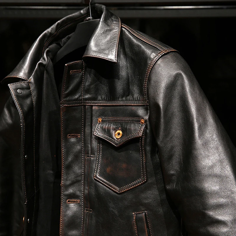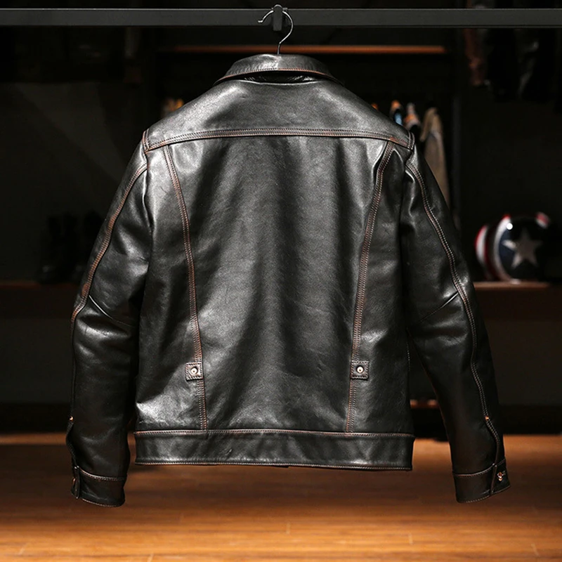 New High quality genuine leather clothings Korean style tea core men's vintage Lapel single thicken cowhide jackets