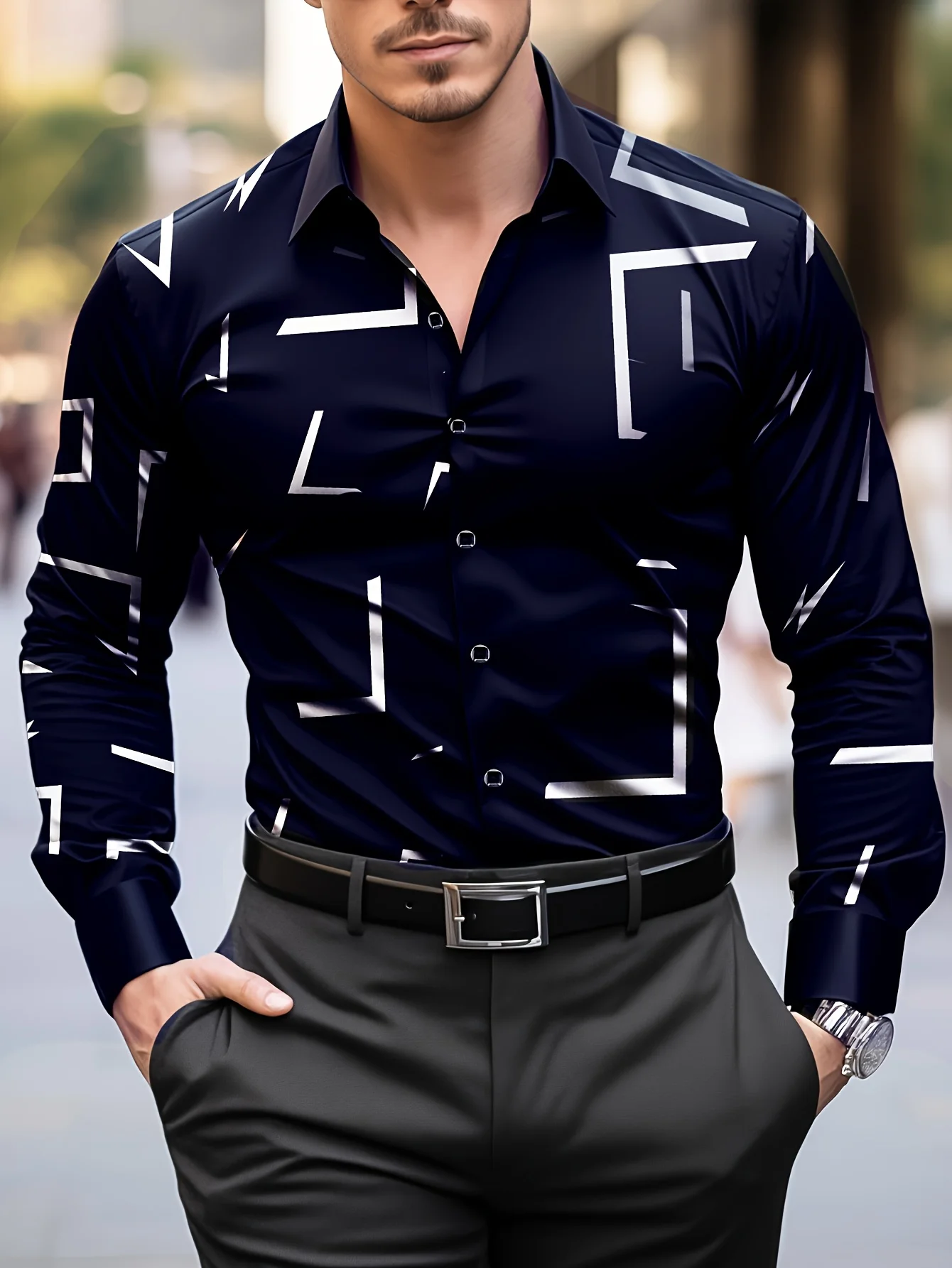 Fashion Men'S Casual Regular Fit Geometric Pattern Long Sleeve Solid Color Polyester Button Lapel Shirt,Non-Stretch Fabric
