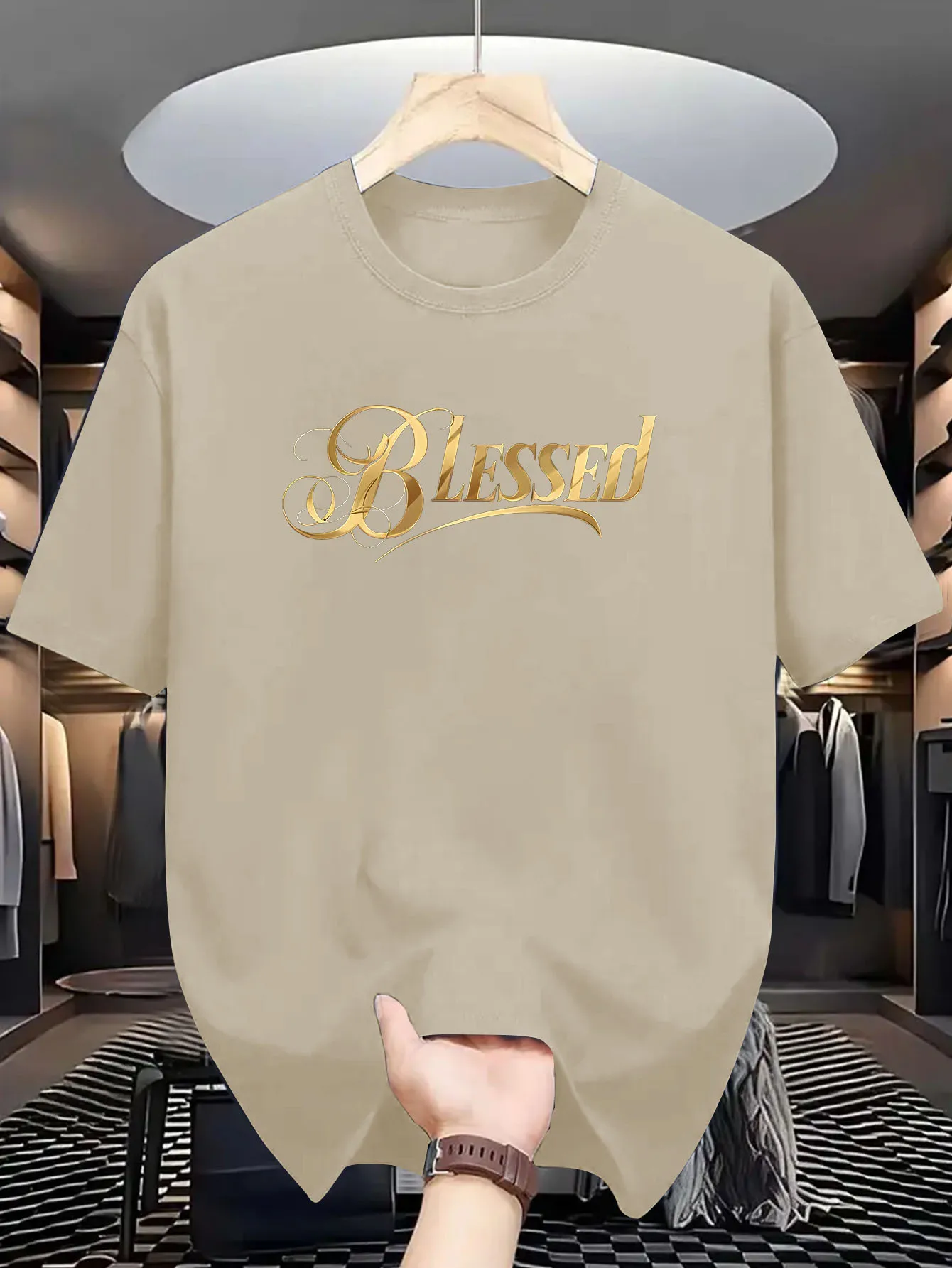 Men's summer 100% cotton fashionable casual loose classic Blessed pattern printed sports round neck short sleeved T-shirt top