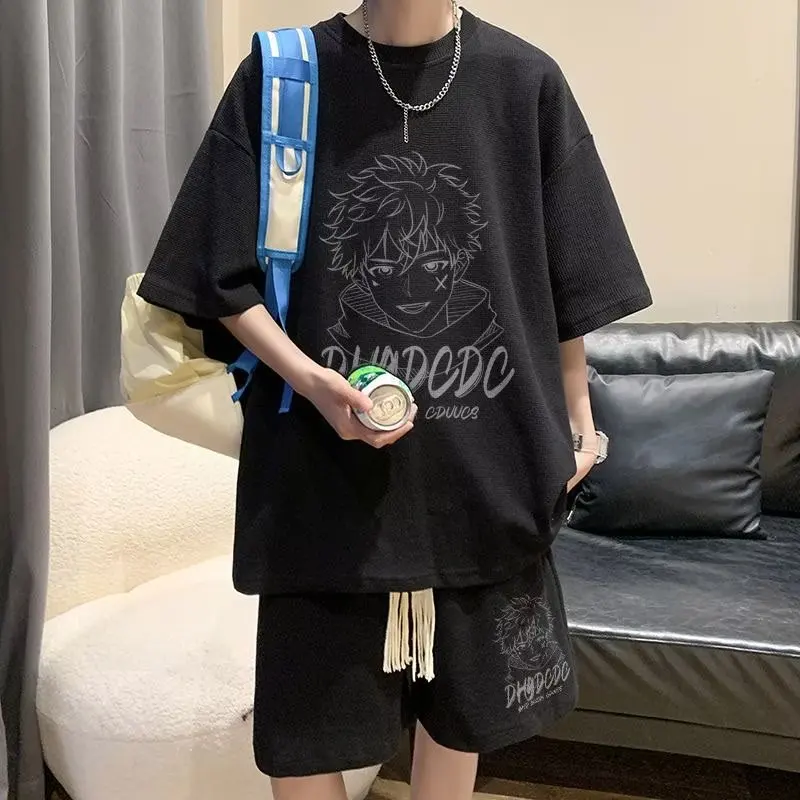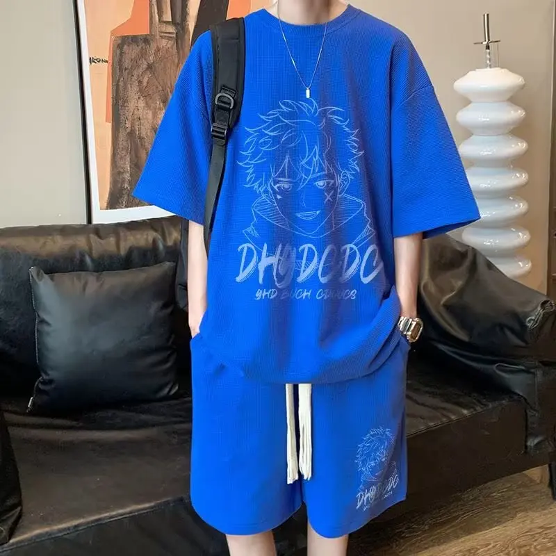 TZ03 Men's new Waffle Summer Suit 2026 Casual T-shirt + Shorts Suit M XXXL 4XL Men's Tracksuit Solid color tracksuit loose suit