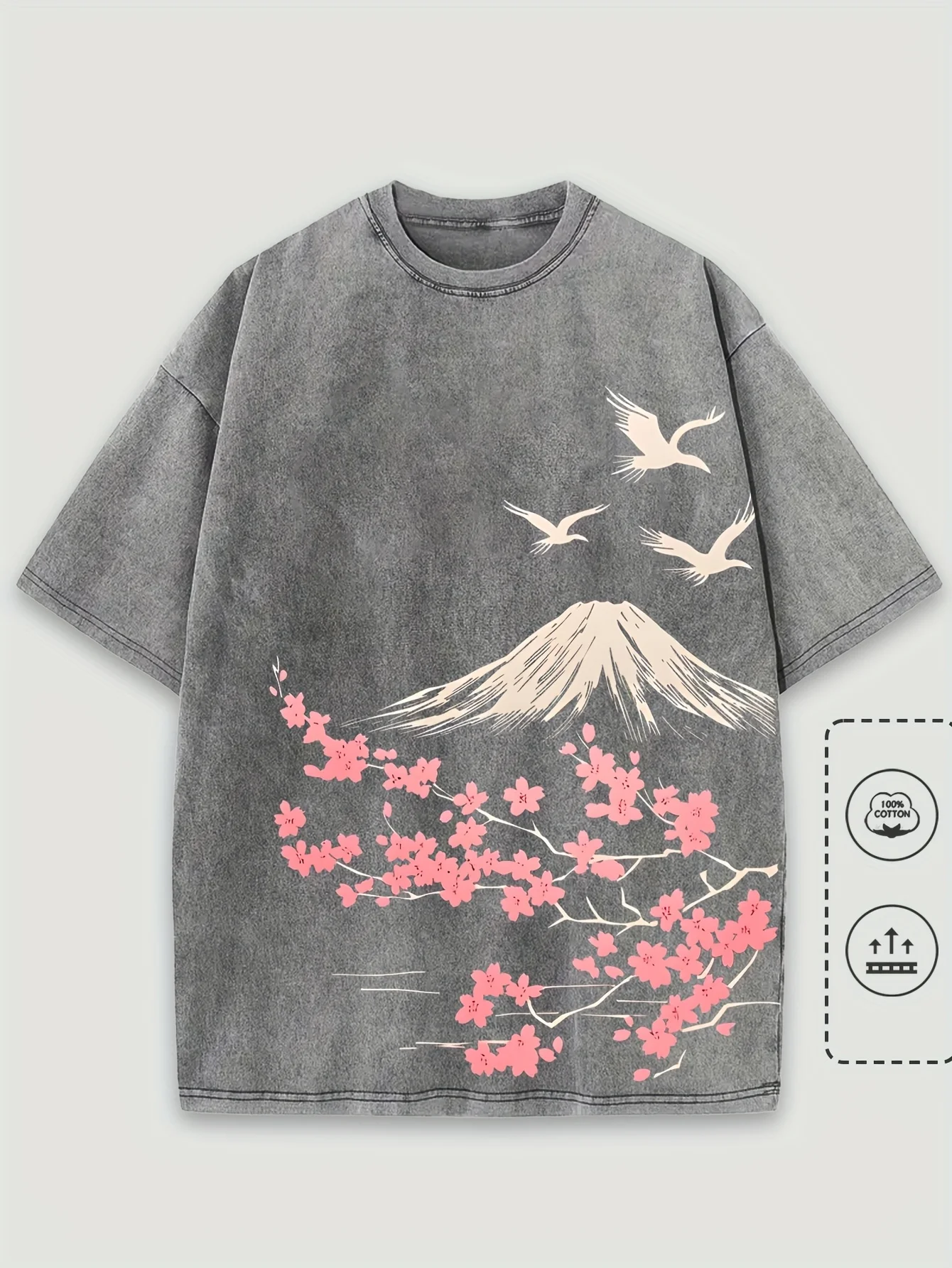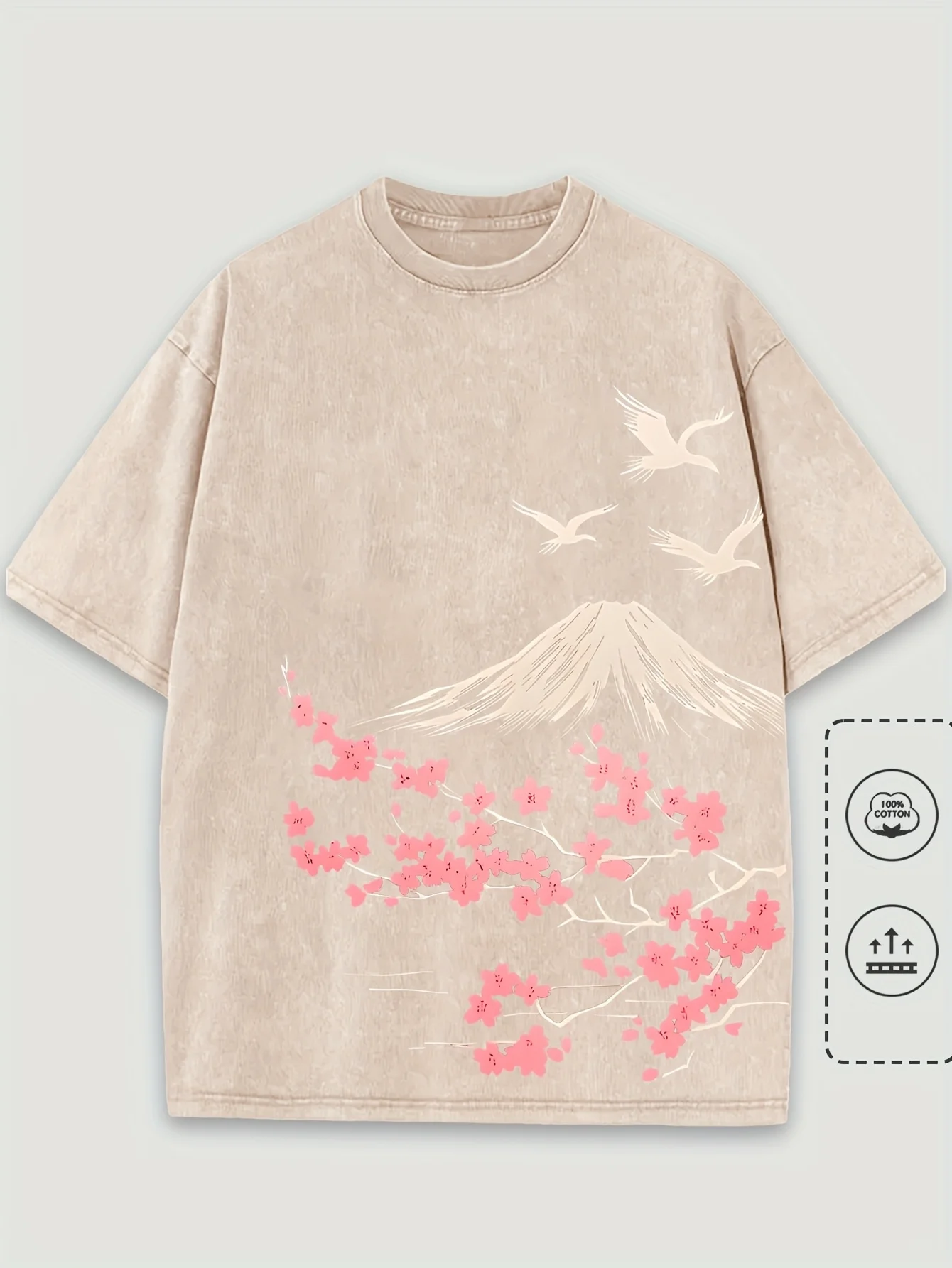 Unisex Vintage Hip Hop Casual Crew Neck T-Shirt 100% Cotton Washed Floral Mountain Graphic Print Streetwear Graphic Tee