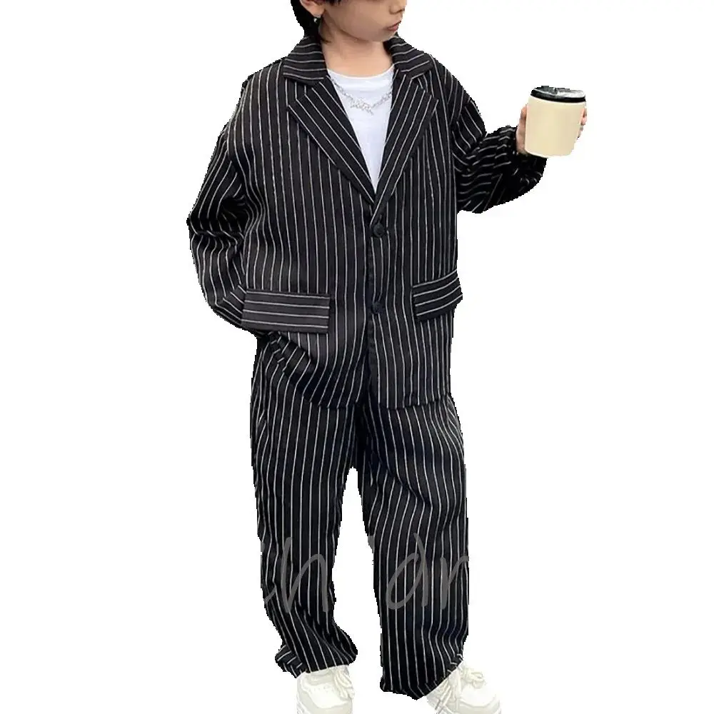 Black Striped Suit For Boy Children's Clothing Classic Single Breasted Loose Fit 2 Pieces Jacket Pants Daily Casual Kids Set