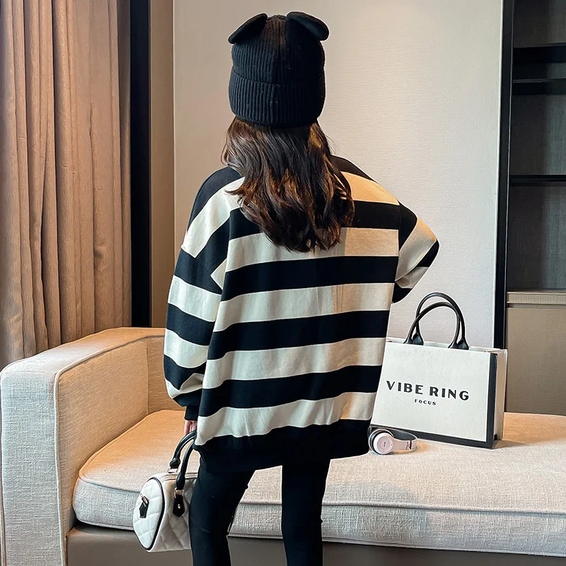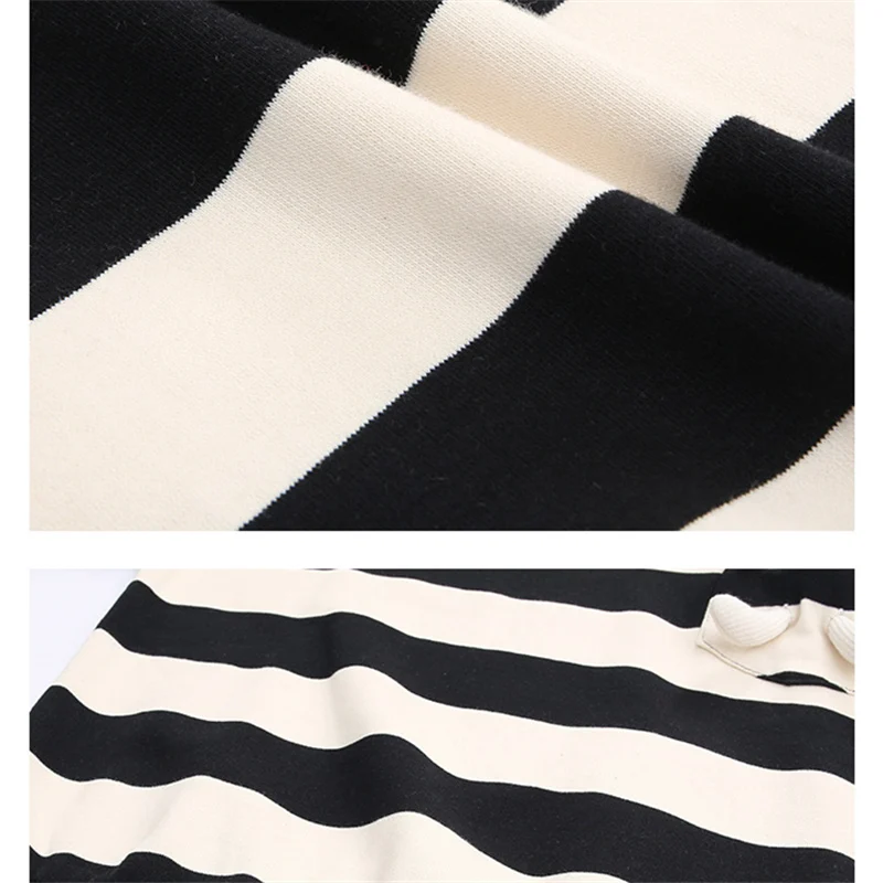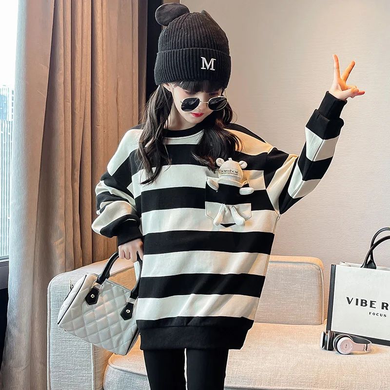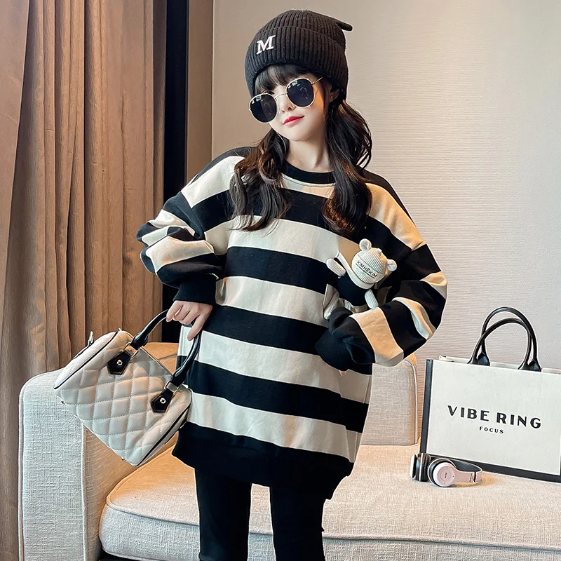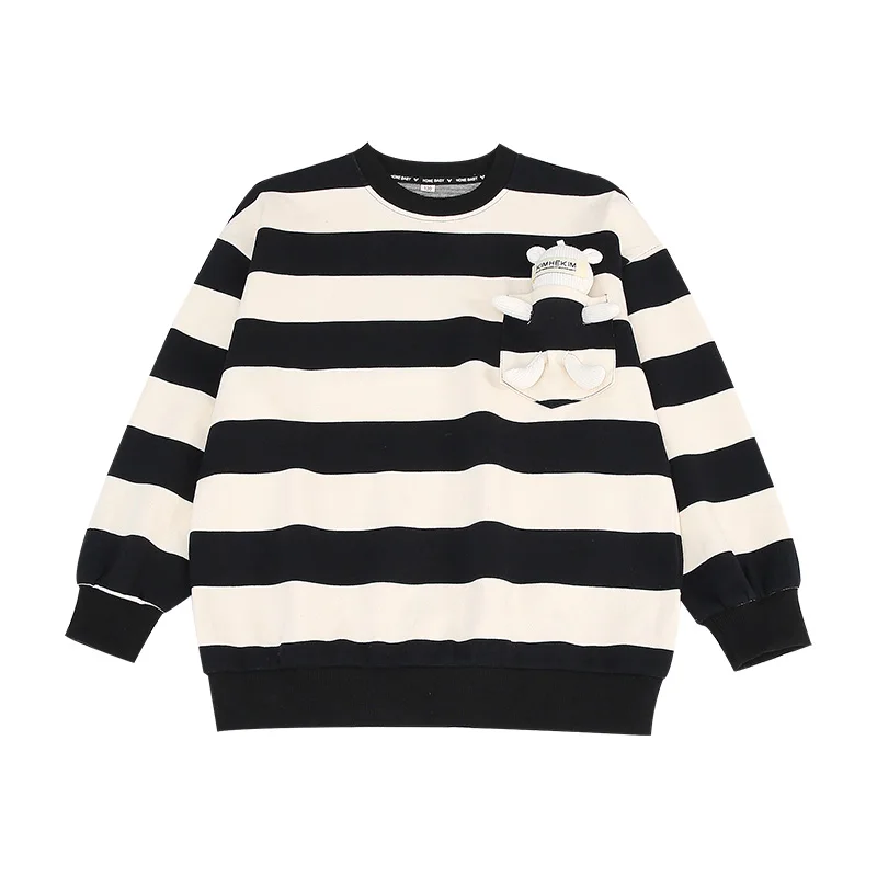 Fashion Child Black White Striped Sweatshirt with Bear Toy for Girls New Spring Clothing Baby Long Sleeve Cotton T-Shirt for Kid