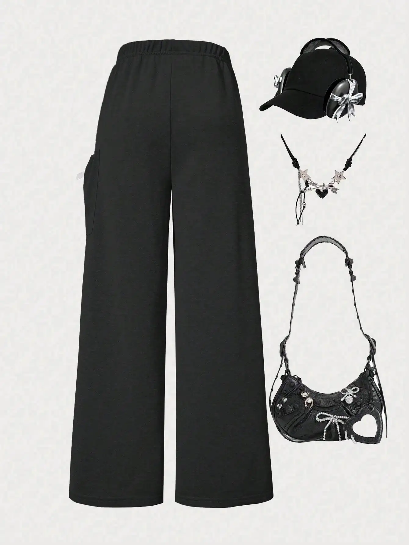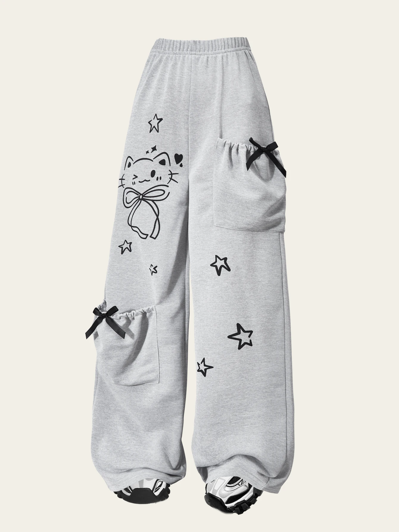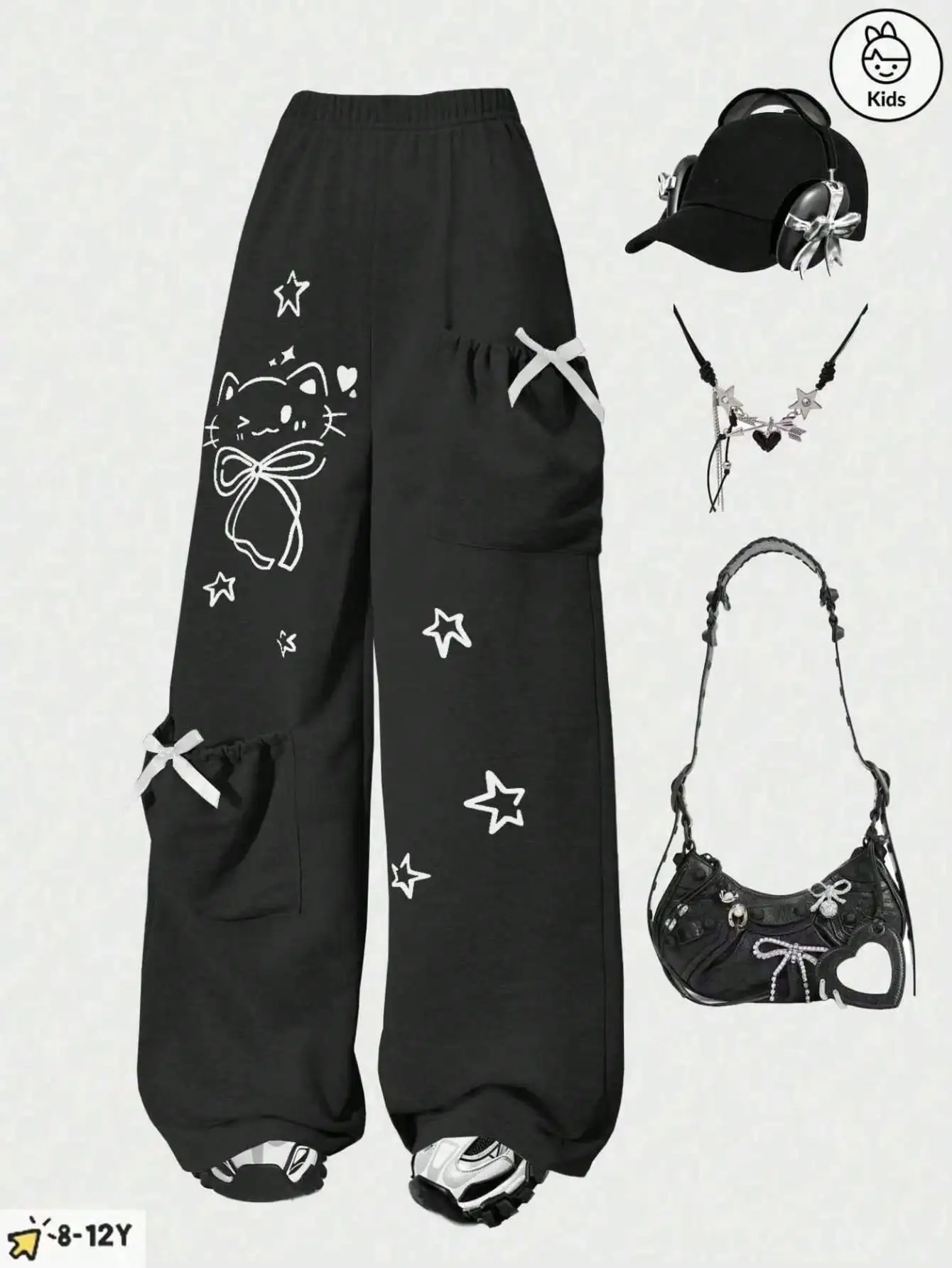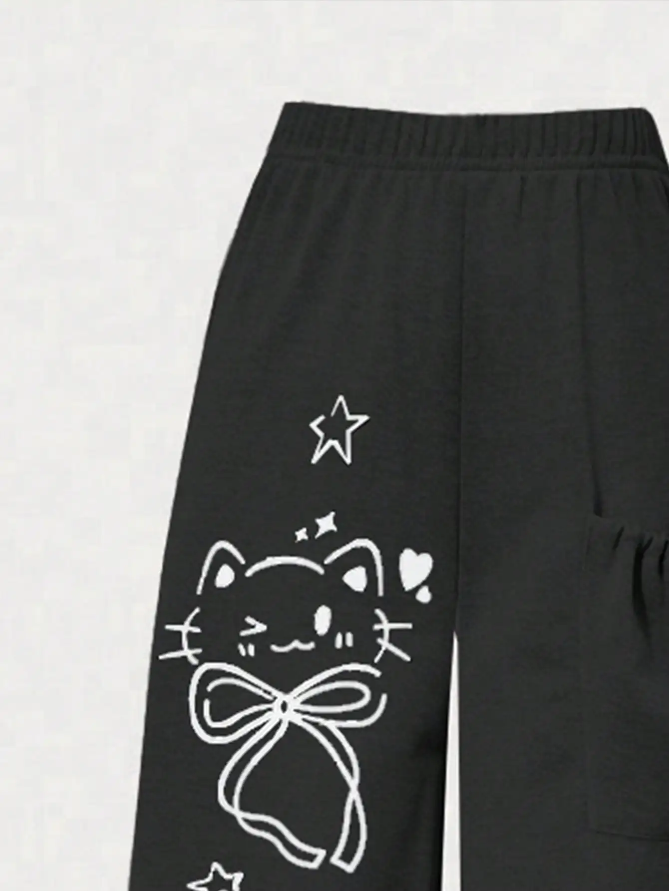Girls' fashion casual trousers, girls' spring, summer, autumn and winter loose straight-leg pants with a kitten pocket design