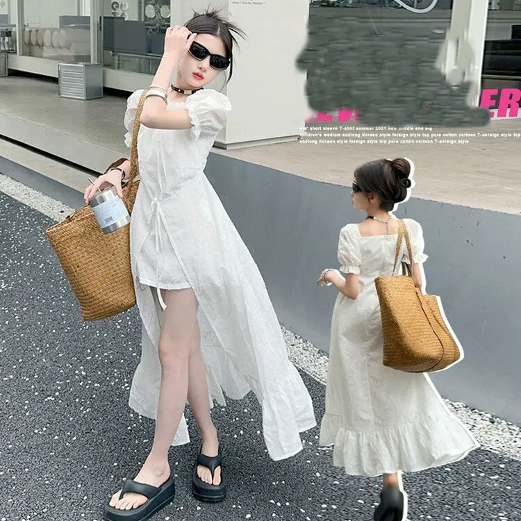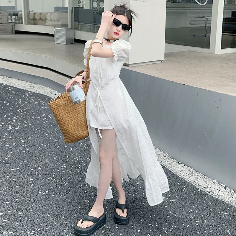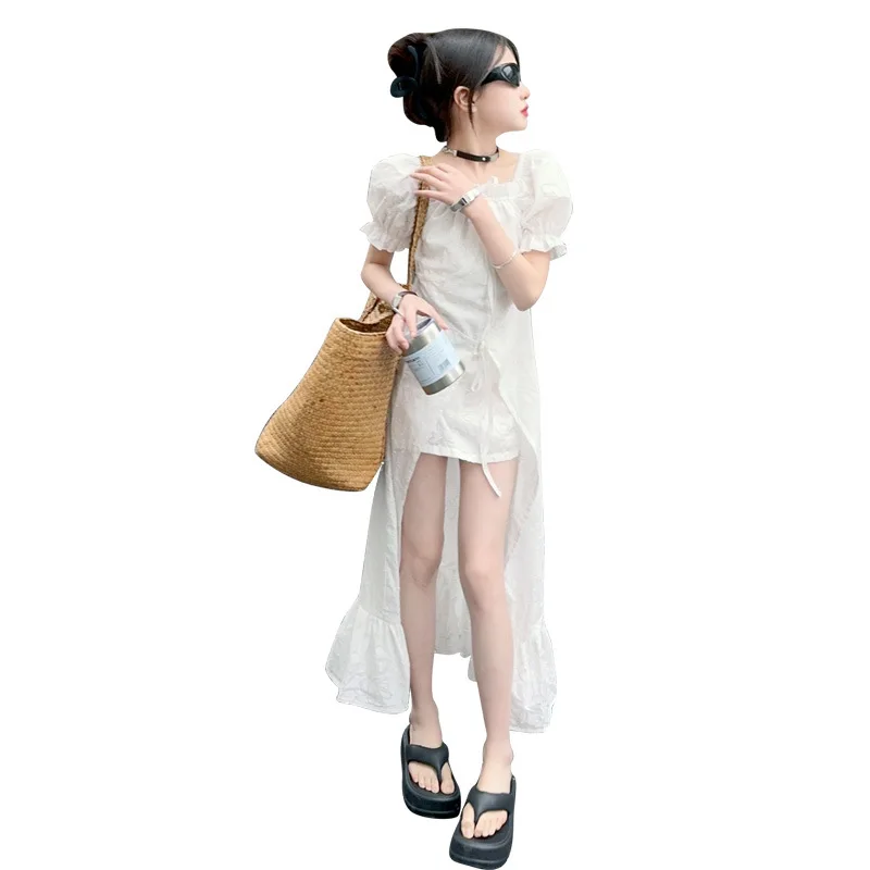 junior girls 2024 French Square Neck White Short Sleeve Dress Puff Sleeve Ruffle Long Skirt Premium teen kids princess Dresses