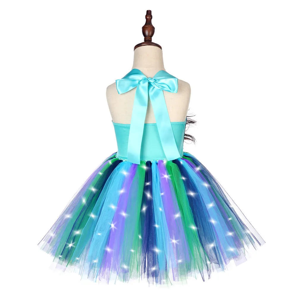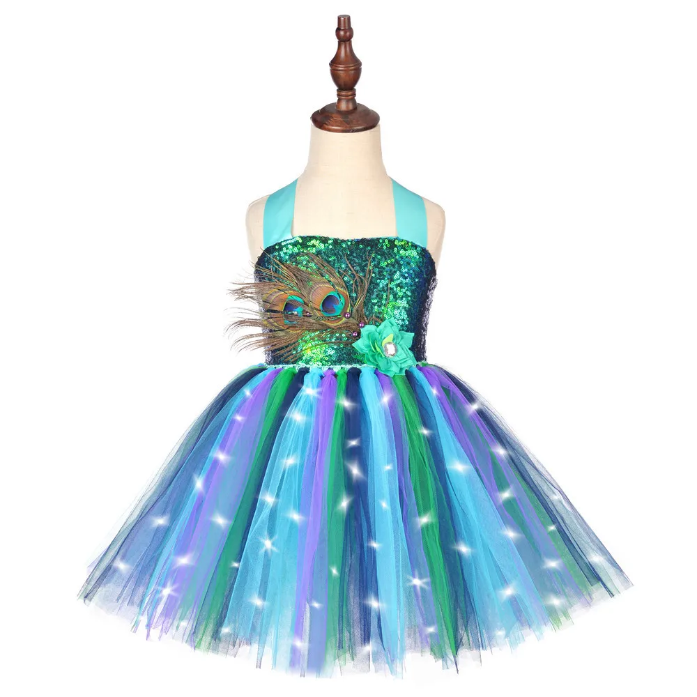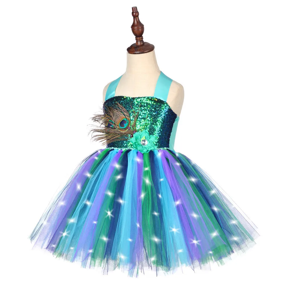 Led Light Peacock Costume for Girls Sequins Flower Feathers Tutu Dress for Kids Halloween New Year Outfit Birthday Party Clothes