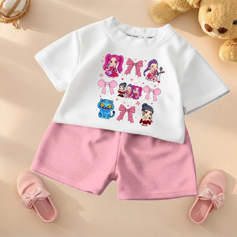 Summer Girls Casual T Shirt Sets K POP Cartoon Printed Kids Fashion Outfits Teen Children's O Neck Short Sleeve Tops Shorts 2pcs