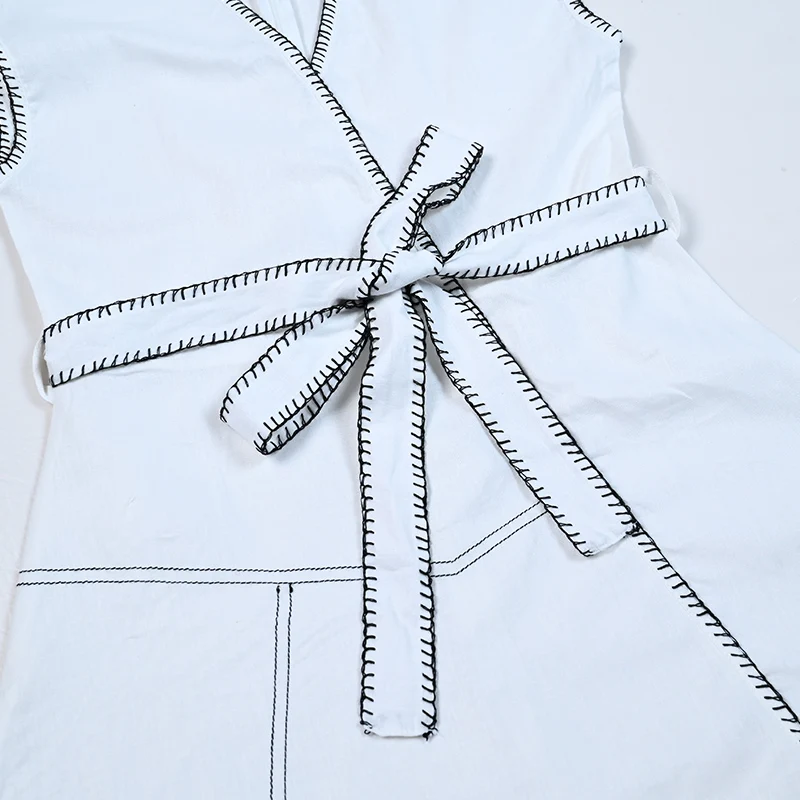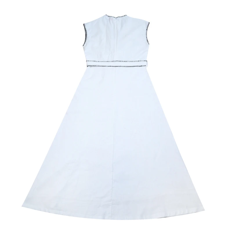 Women wrap dress maxi white color with contrasted special decoration stitching girl sleeveless cotton linen fabric waist belt