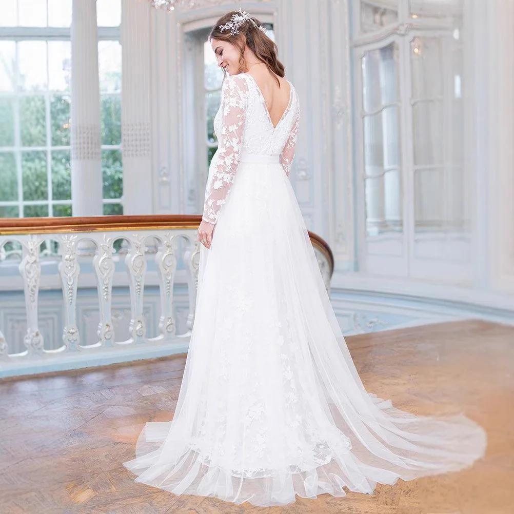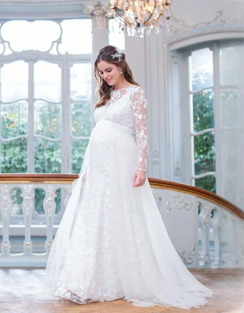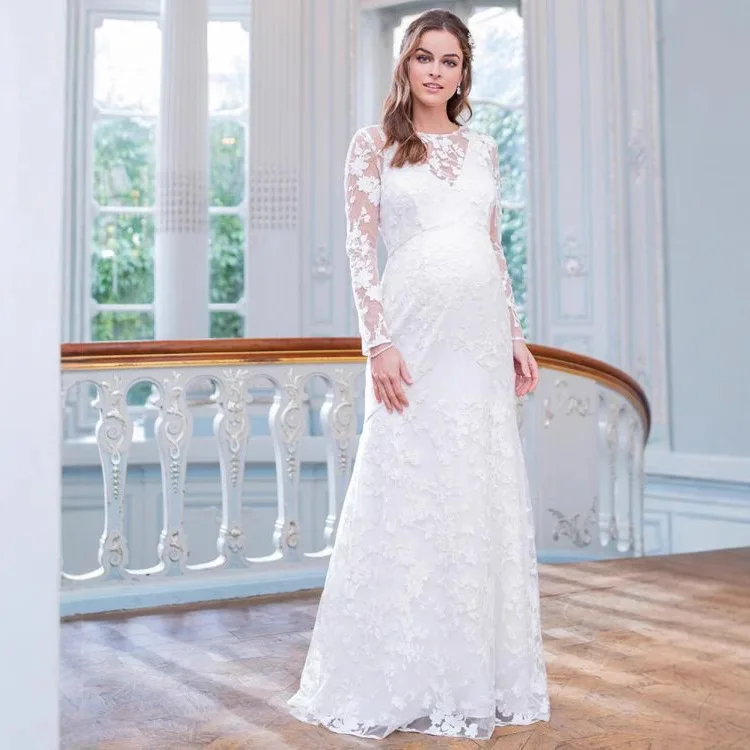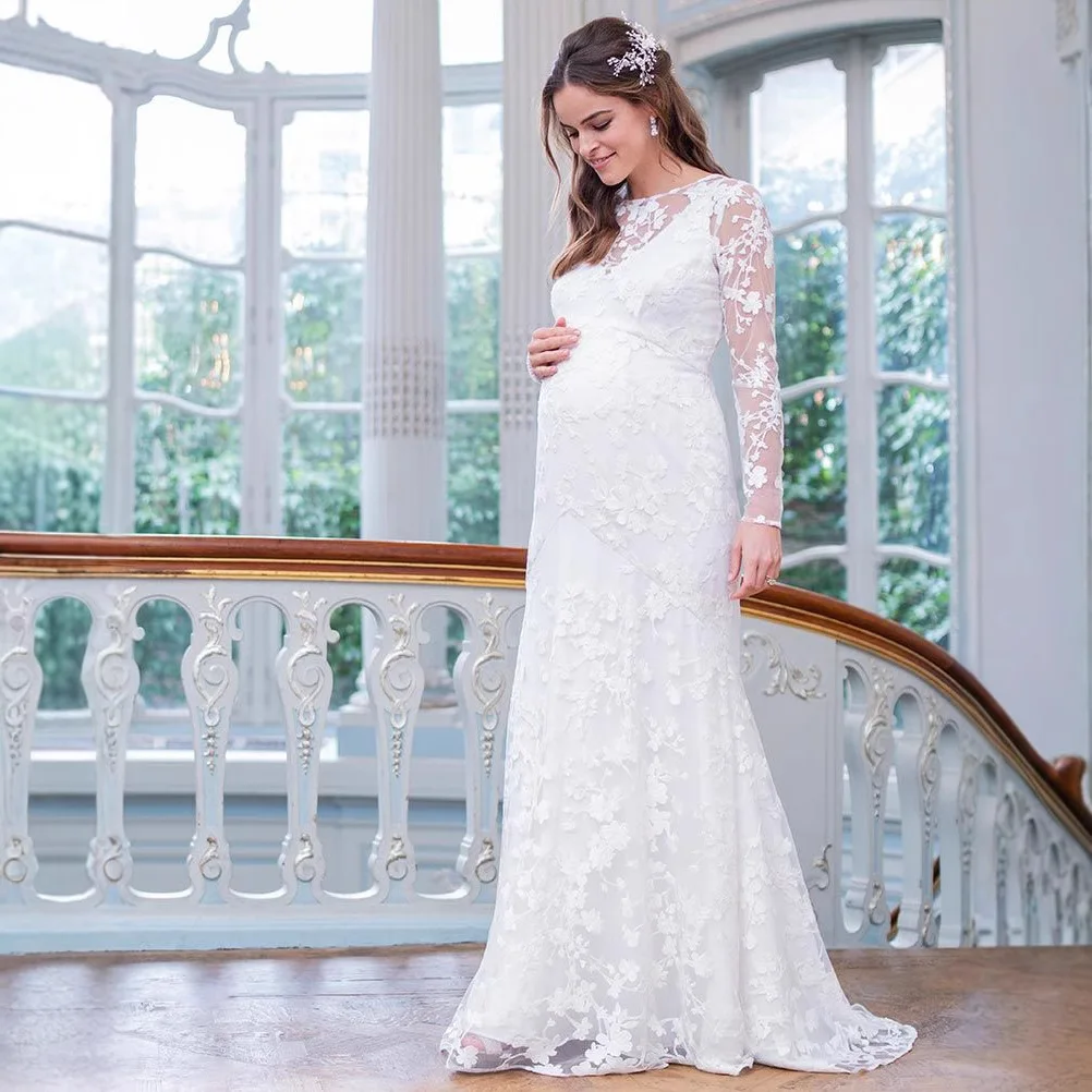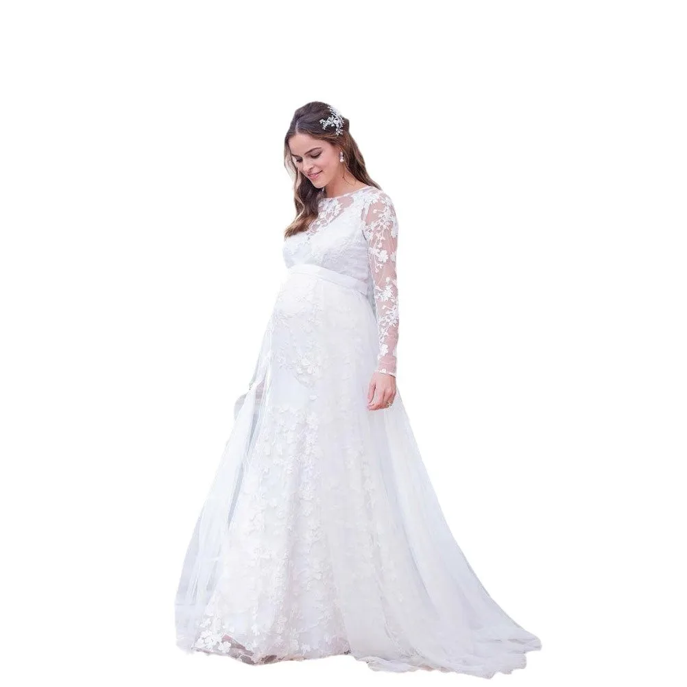 Maternity Full maxi long Dress Lace Long Sleeve V-Shaped Back Hem Puff Maternity Wedding Dress Photography Dresses Pregnancy